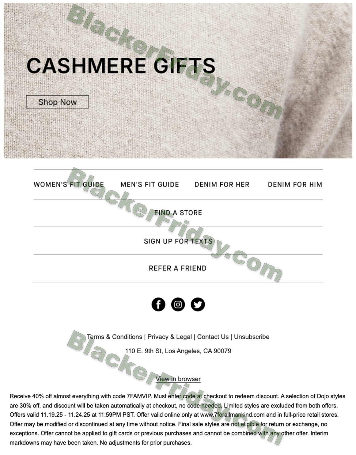 The Black Friday sale is already live for early access members as of Wednesday, November 19, 2025, both online at 7forallmankind.com and in full-price retail stores. This early access period is available to shoppers who are signed up for the brand’s newsletter and use promo code 7FAMVIP at checkout.