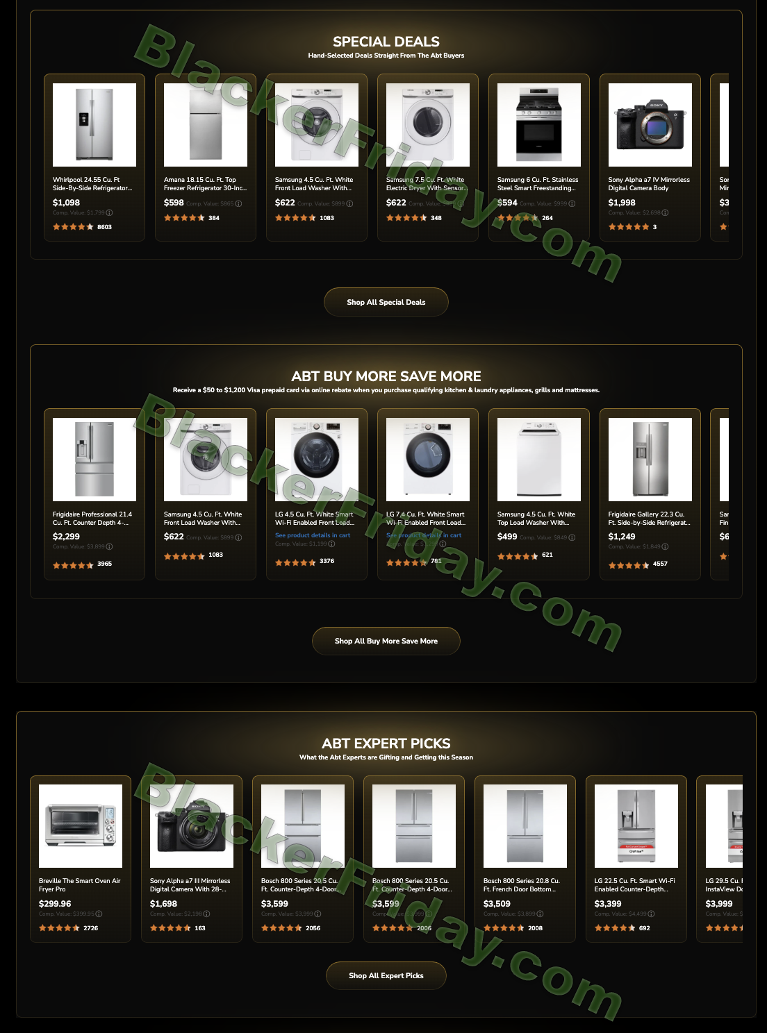 If you’re shopping for a new washer, dryer, refrigerator, or dishwasher, Black Friday is one of the best times to buy. ABT typically offers deep discounts on top brands like LG, Samsung, Whirlpool, and GE. These discounts can range anywhere from 15% to 40% off, depending on the model and brand.