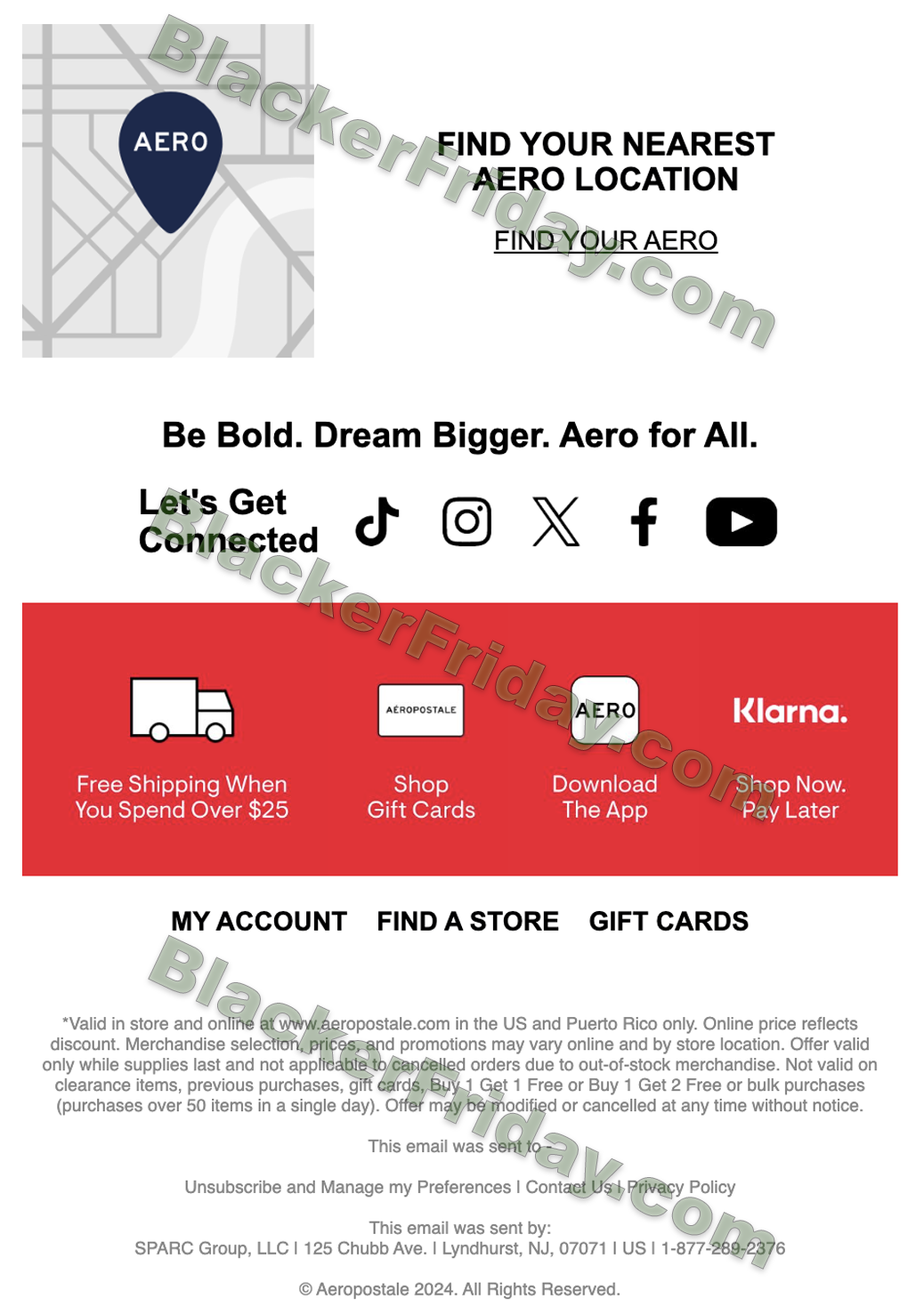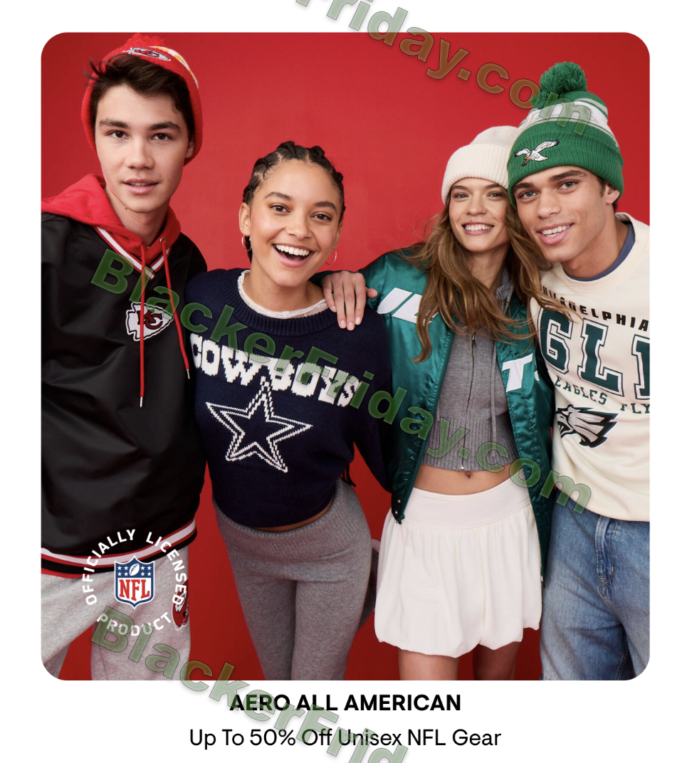 Based on past sales, we can expect broad sitewide cuts in the range of 60 to 70% off. Aeropostale also highlights special categories. In 2024, for example, jeans were offered at $25 per pair, unisex NFL gear was up to 50% off, and “super giftable” items started around $8. Free shipping was offered on orders over $25, which is likely to return in 2025. These numbers give us a good benchmark for the kinds of markdowns that are realistic this year.