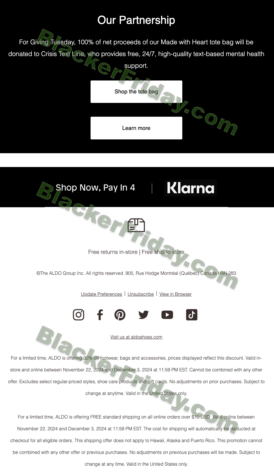 The Cyber Monday name will still carry weight though. Aldo often refreshes its marketing on that day and may rotate in a handful of new limited-time offers or flash discounts.