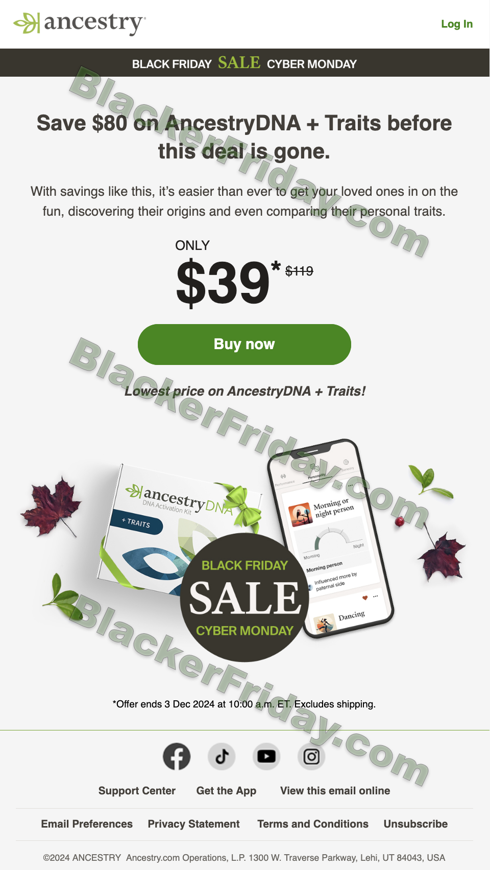 In 2024, Ancestry launched its Black Friday offers on Thanksgiving Day and kept them running through the morning of the following Tuesday. That six-day stretch covered Thanksgiving, Black Friday, the weekend, and Cyber Monday. This year, the same pattern is likely.