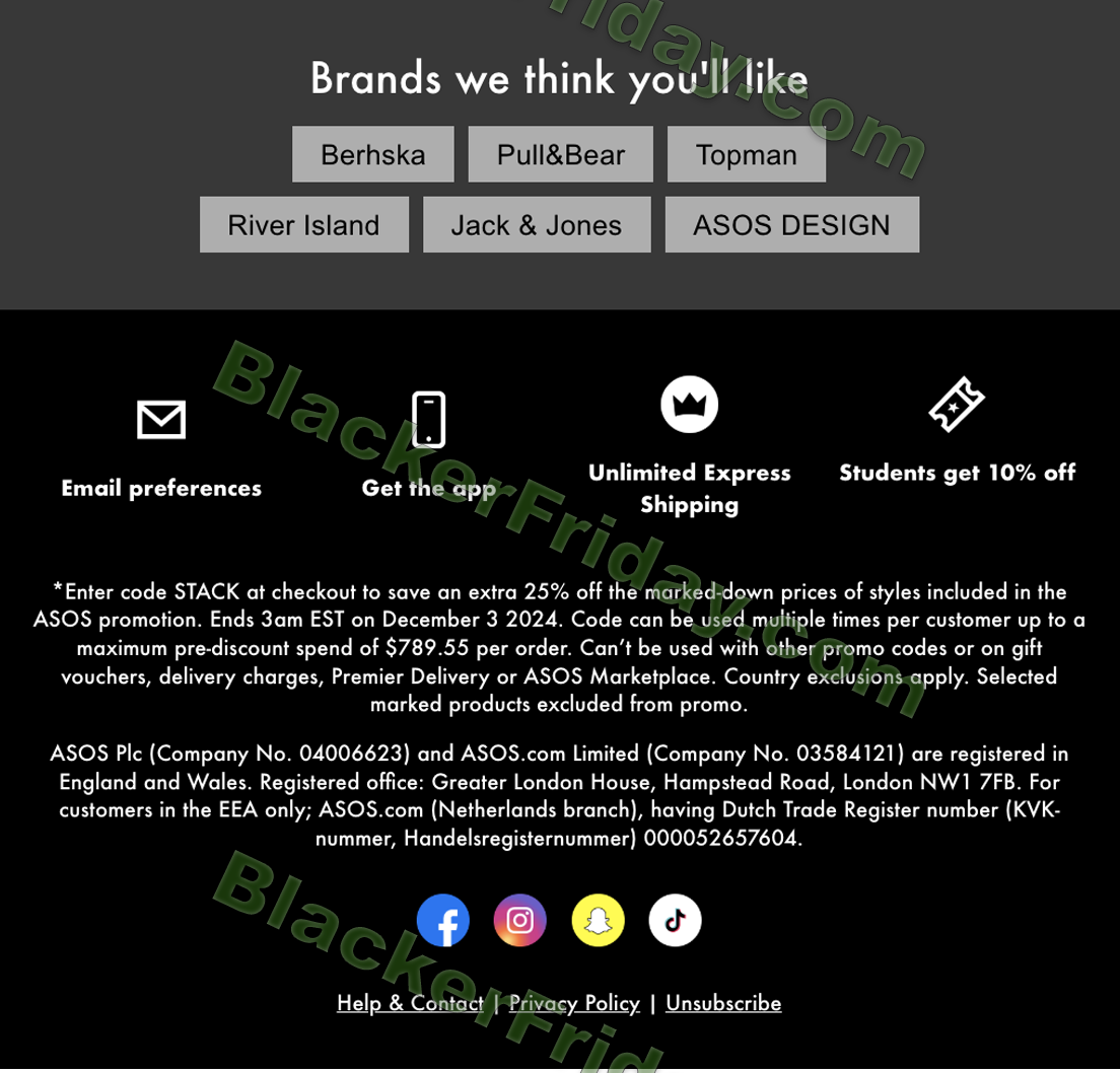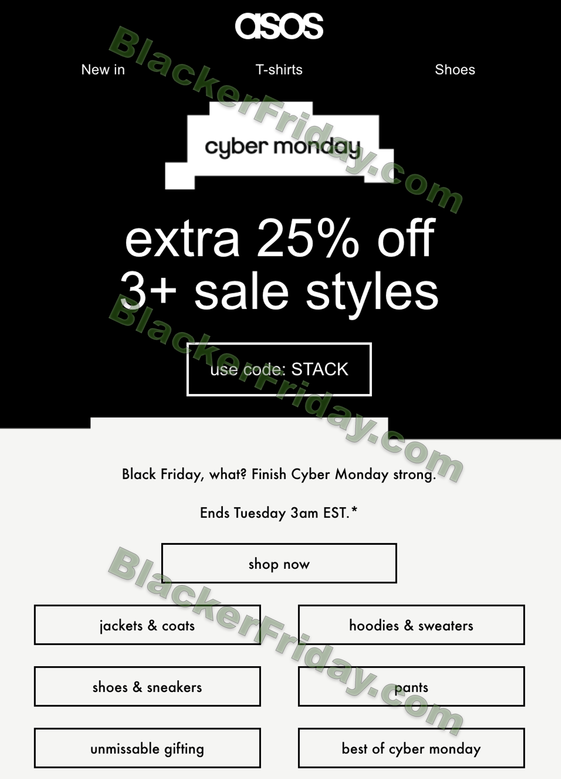 Last year, the code was STACK, and it offered an extra 25% off the lowest listed sale price when buying three or more items from the sale section. That type of multi-item promotion is something we can expect again in 2025. ASOS often uses Cyber Monday to encourage larger purchases by adding these bonus savings on top of already-reduced prices.