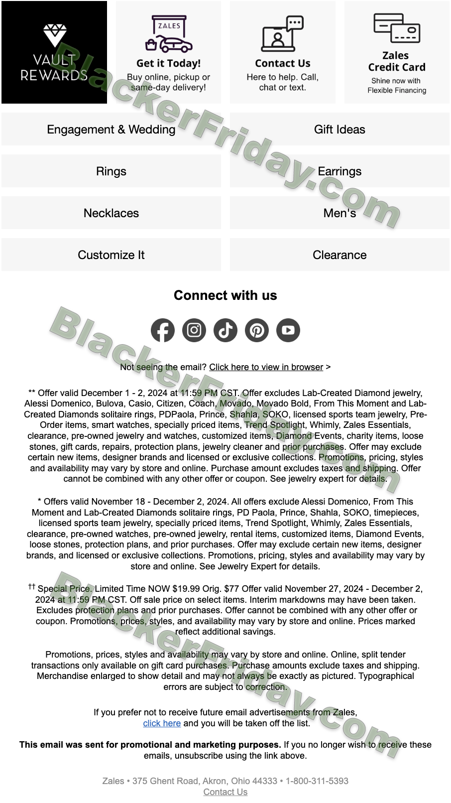 Not all items at Zales are included in the Cyber Monday sale. Exclusions usually cover designer collections such as Alessi Domenico, Shahla, and SOKO, custom or build-your-own jewelry, loose stones, certain watches, pre-owned or clearance items, protection plans, repairs, prior purchases, and new arrivals or exclusive collections.