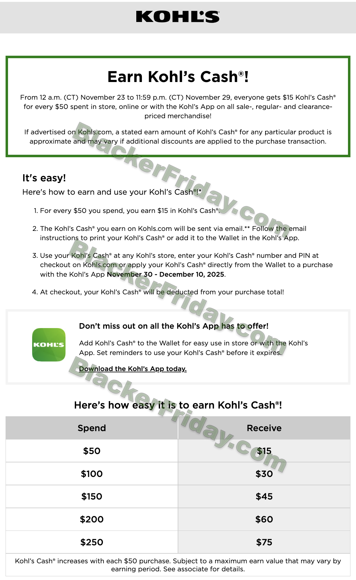 Again, Kohl’s Cash will be active during this time, especially as the Thanksgiving weekend approaches. In recent years, the redemption window for Kohl’s Cash earned during this period started the day after Black Friday and ran for about 12 days.