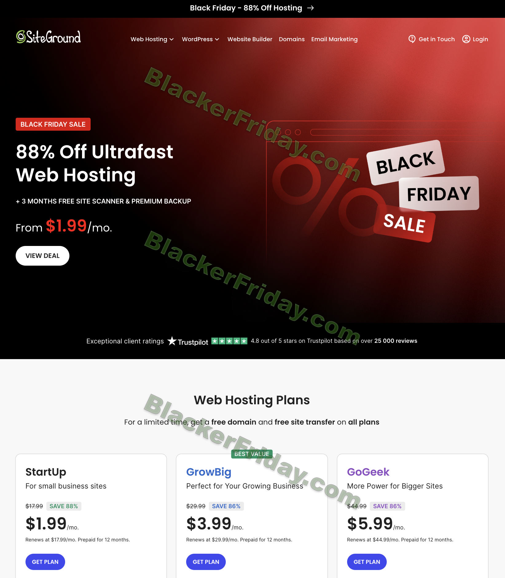 SiteGround’s Black Friday deals cover all three of its main shared hosting plans: