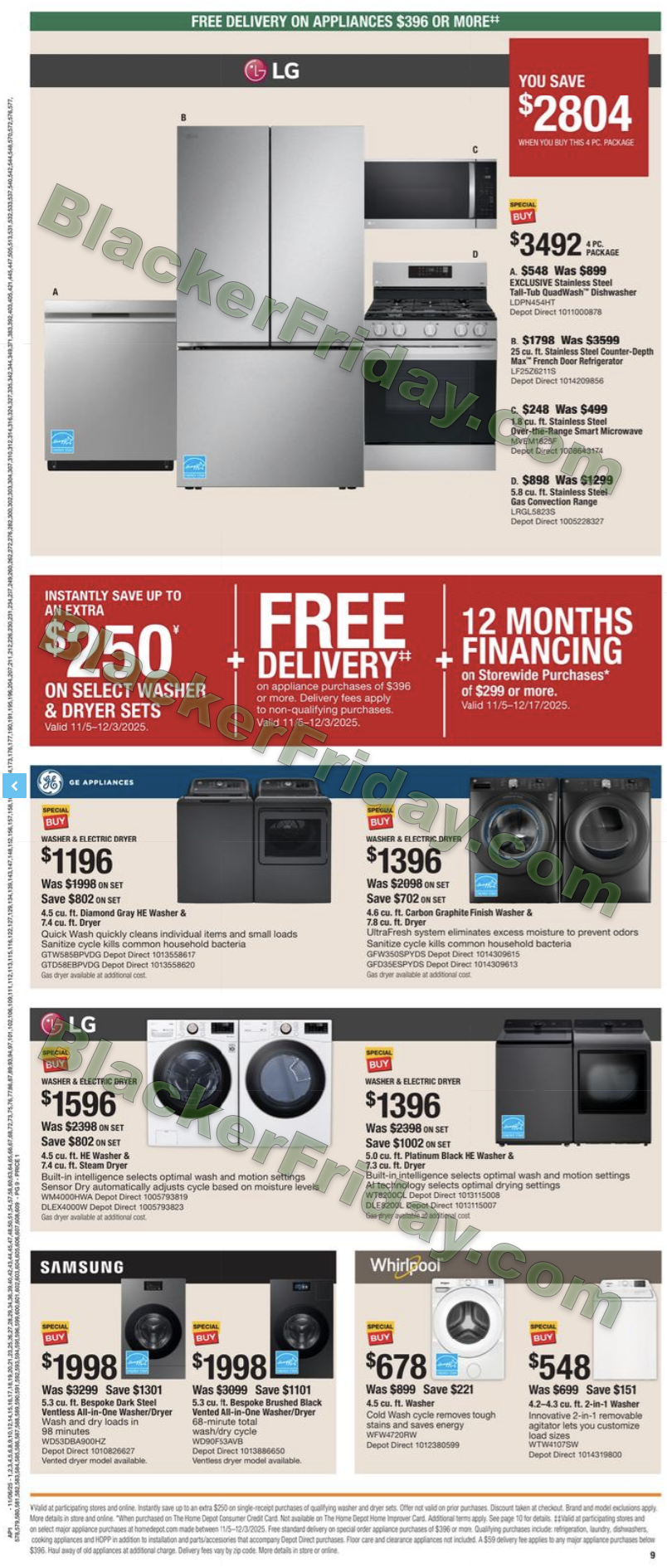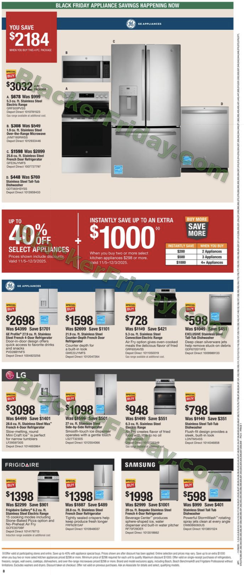 This is where you’ll see some of the deepest discounts. Home Depot typically promotes appliance deals all month long in November, with some overlapping into Black Friday week. Last year’s Black Friday sale included: