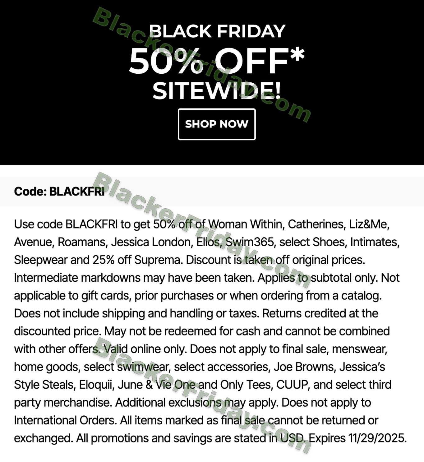 Use promo code BLACKFRI to get 50% off original prices for Woman Within, Catherines, Liz&Me, Avenue, Roamans, Jessica London, Ellos, Swim365, select shoes, intimates, and sleepwear. Intermediate markdowns may have already been applied. The discount applies to the subtotal at checkout. -