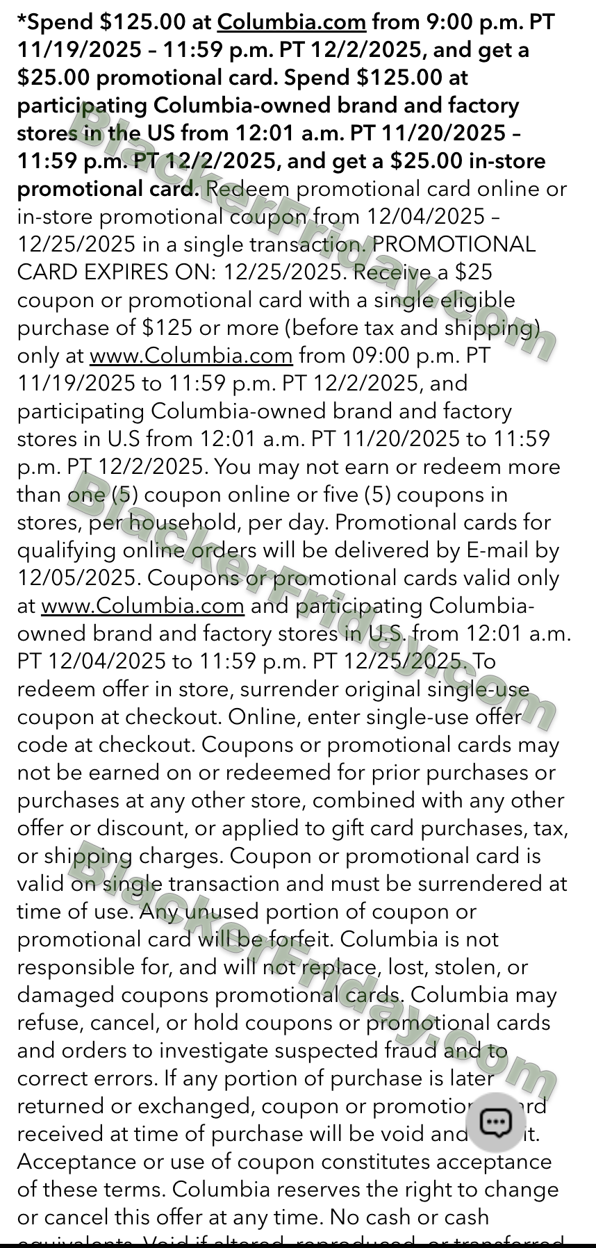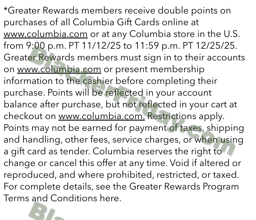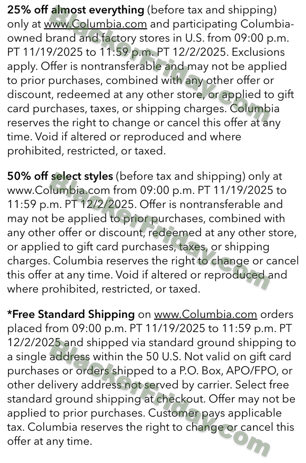 - Up to 40% off select styles (before tax and shipping) at columbia.com from 9:00 PM PT 10/29/2025 to 9:00 PM PT 11/19/2025.