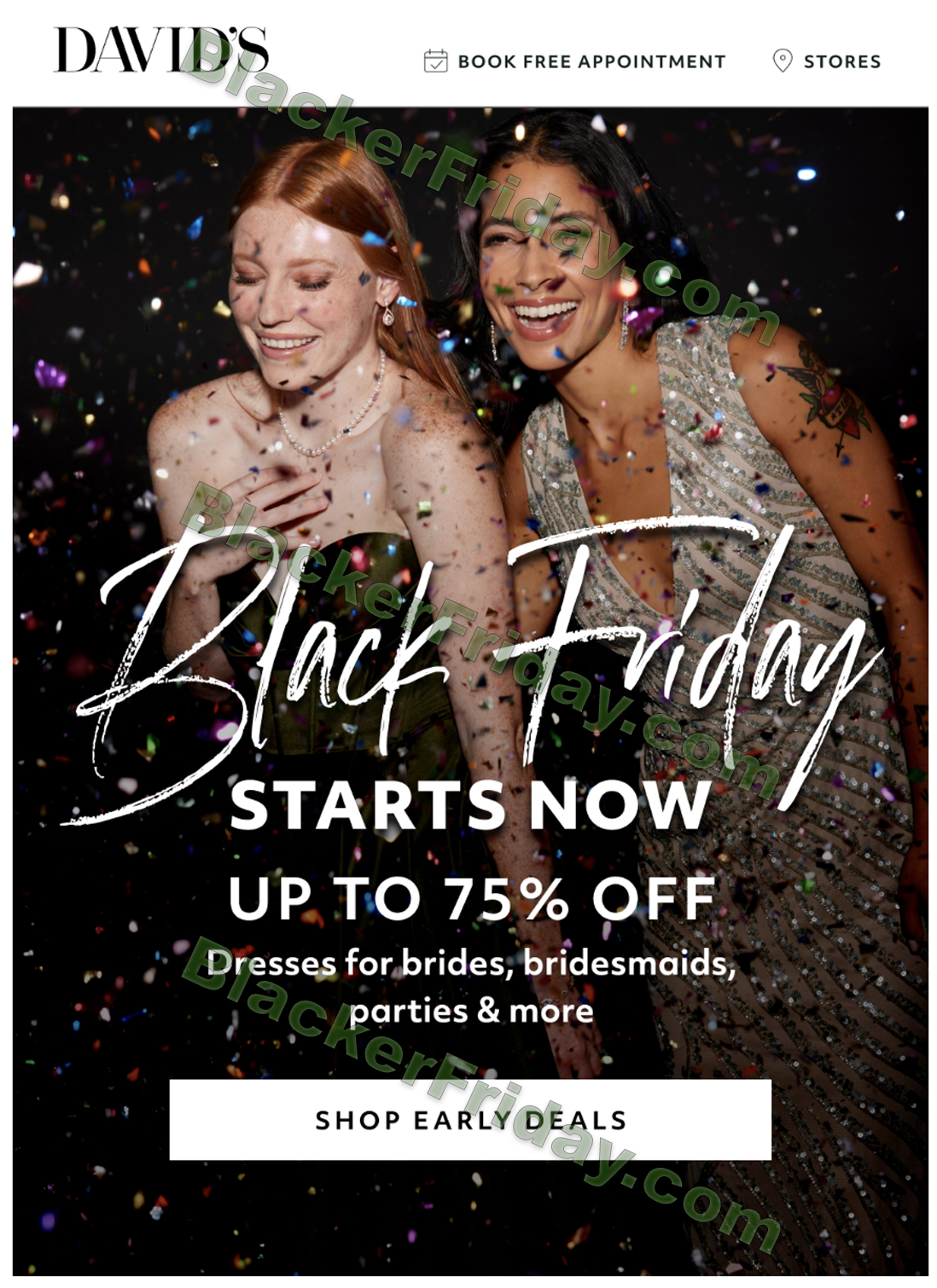 Updated on Saturday, November 15, 2025: David’s Bridal kicked off it’s Black Friday 2025 sale today! The event features selected dresses marked down by as much as 75% across multiple categories. The company has not listed an official end date but based on past years, these deals will likely continue through Thanksgiving weekend and may end on Cyber Monday, December 1, 2025, or earlier if inventory sells out.