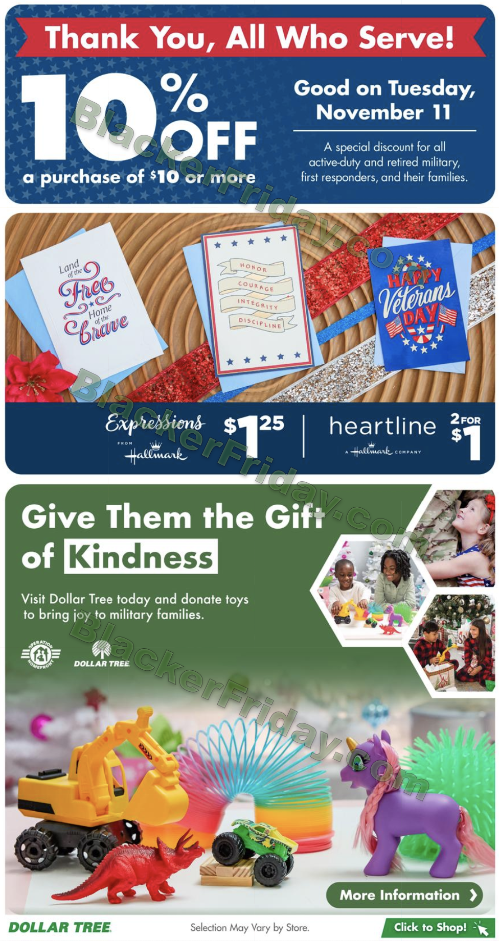- One special offer this year: on November 11, 2025, Dollar Tree is offering an extra 10% off a purchase of $10 or more for active-duty military, first responders and their families.
