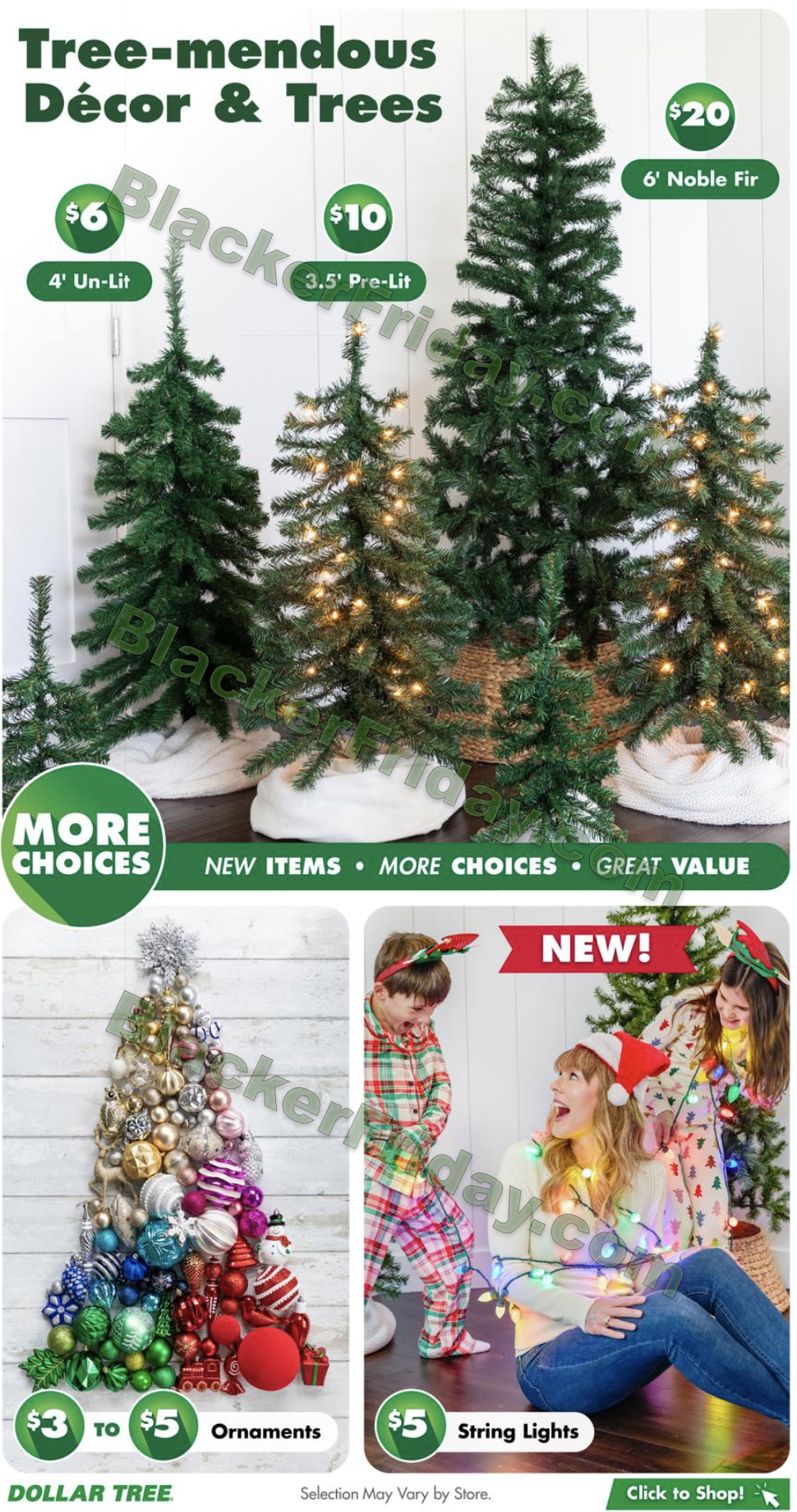 - Artificial Christmas trees: one deal is a 4 foot un-lit tree for $6. Another is a 3.5 foot pre-lit tree for $10. And a 6 foot “noble fir” style tree is listed for $20.