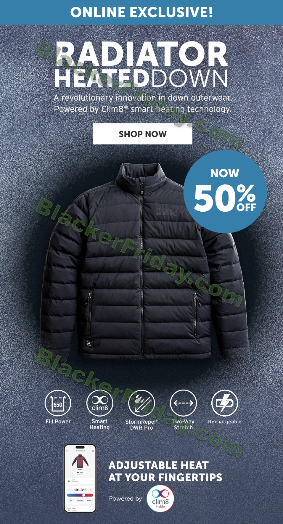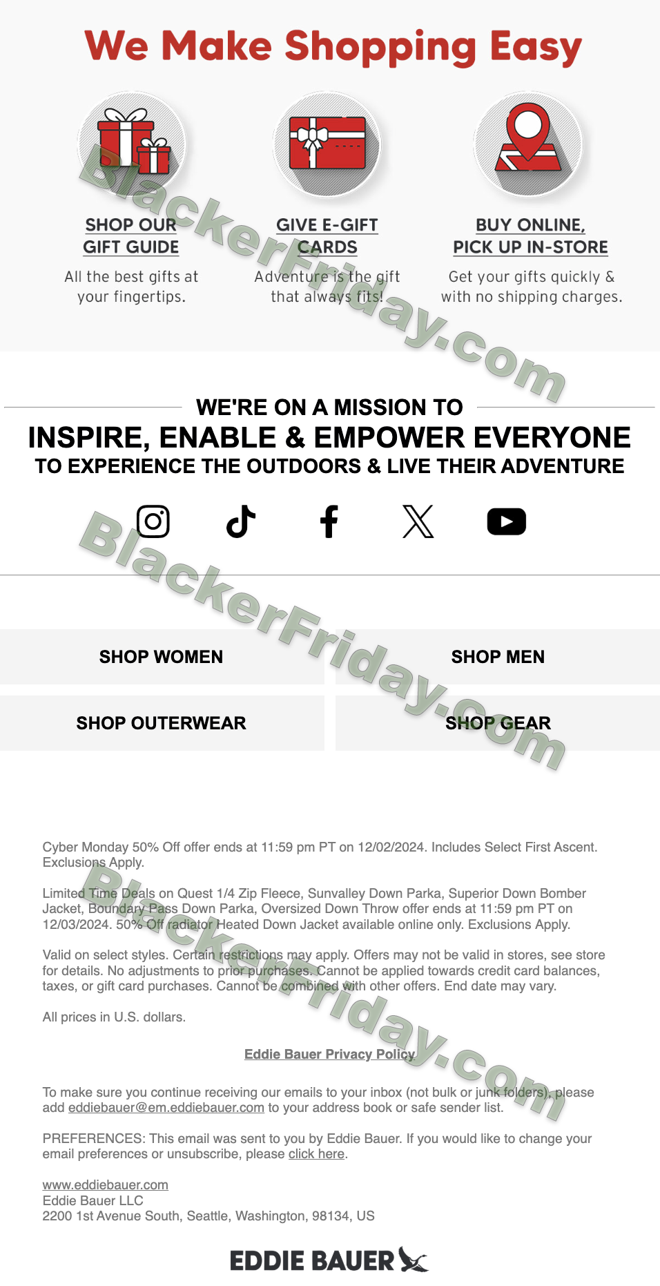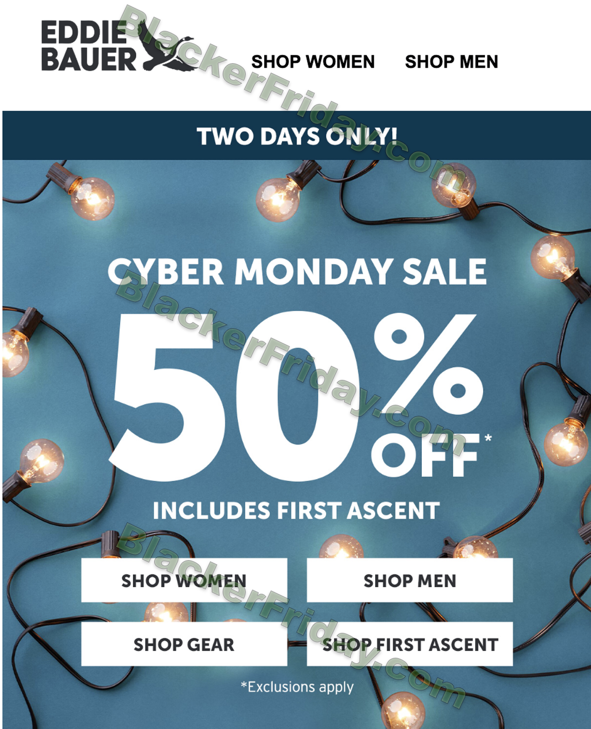 Eddie Bauer usually keeps its Cyber Monday terms consistent each year. The sale will likely: