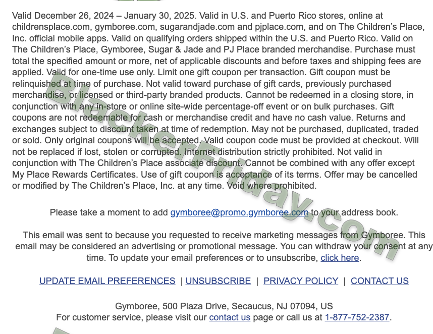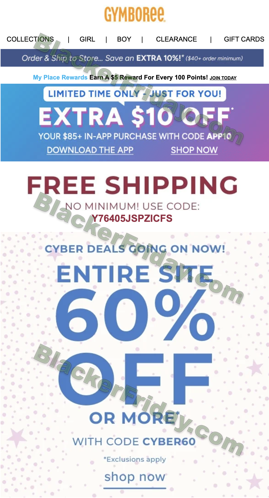 Occasionally, Gymboree provides one-time-use coupons around Thanksgiving, such as $10 off orders over $85. While not guaranteed, if offered, these codes usually work through the broader Black Friday period, which can include Cyber Monday. Coupons must be applied at checkout and cannot be reused.