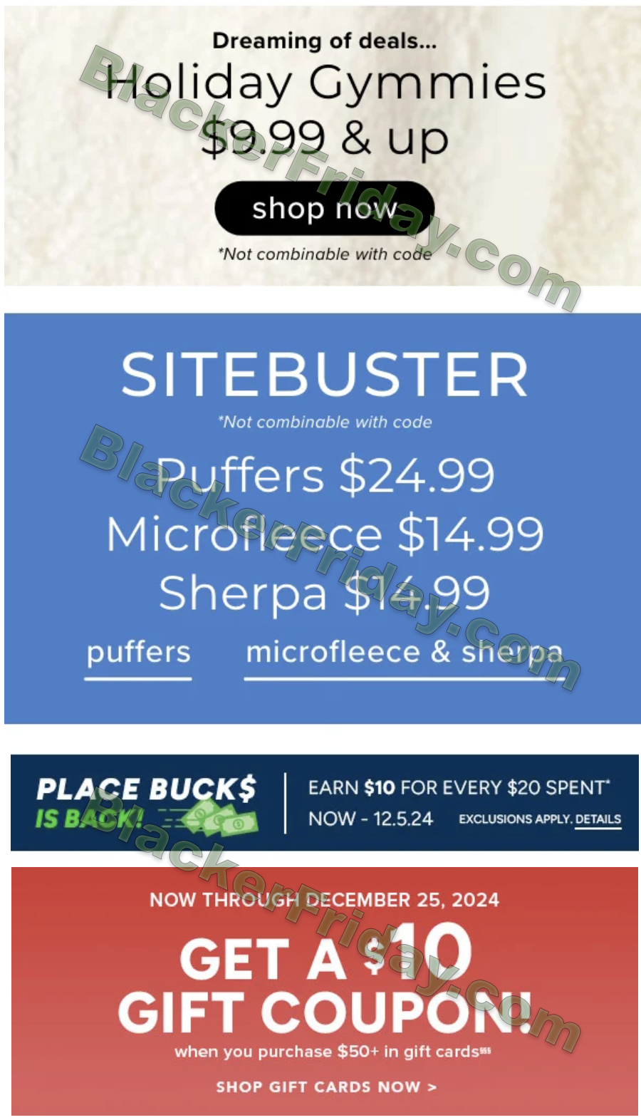 Clearance items typically see up to 70% off and may be refreshed during the sale period. Extra discounts on clearance items are rare, and coupon codes generally do not apply. Additionally, Gymboree has offered gift card bonus promotions during the Black Friday period, which could extend through Cyber Monday.