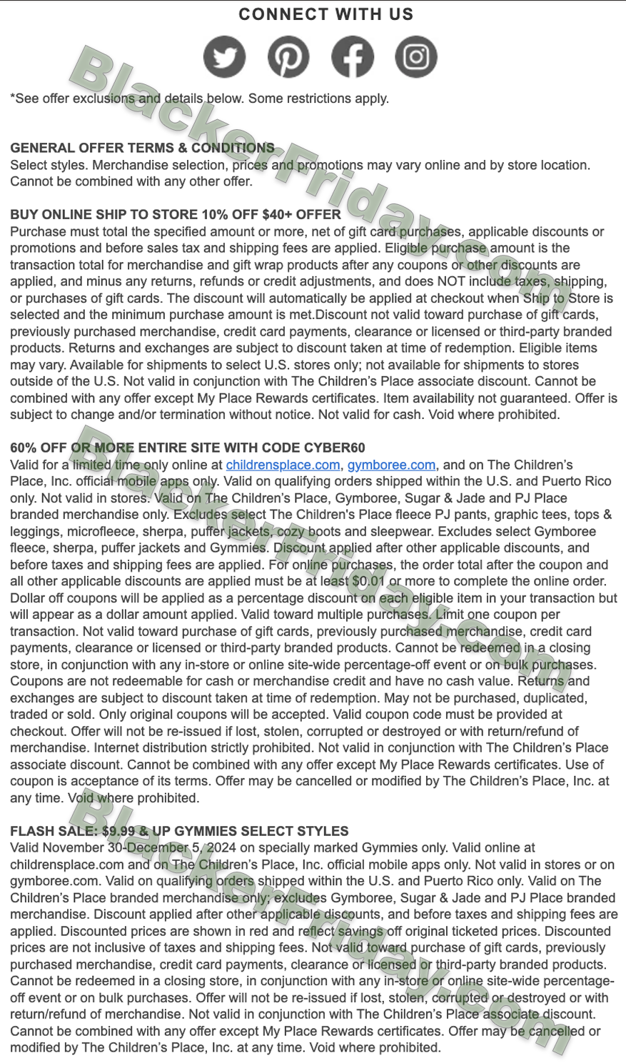 Cyber Monday shopping at Gymboree will be subject to the same restrictions as the Black Friday sale: