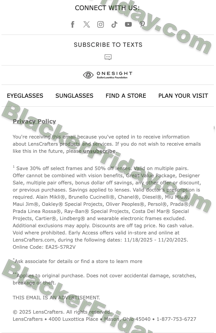 LensCrafters is giving email subscribers and in-store shoppers a head start on Black Friday. From Tuesday, November 18 through Thursday, November 20, 2025, you can shop select frames and lenses before the main sale begins: