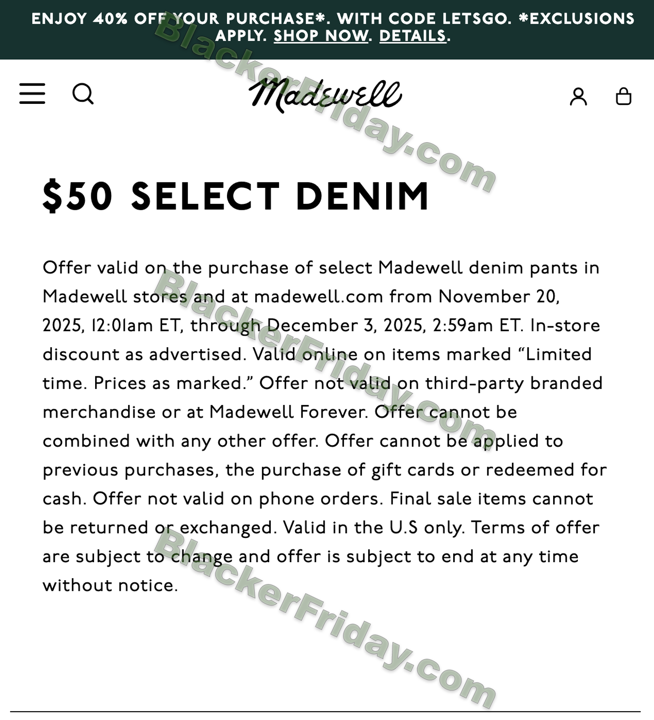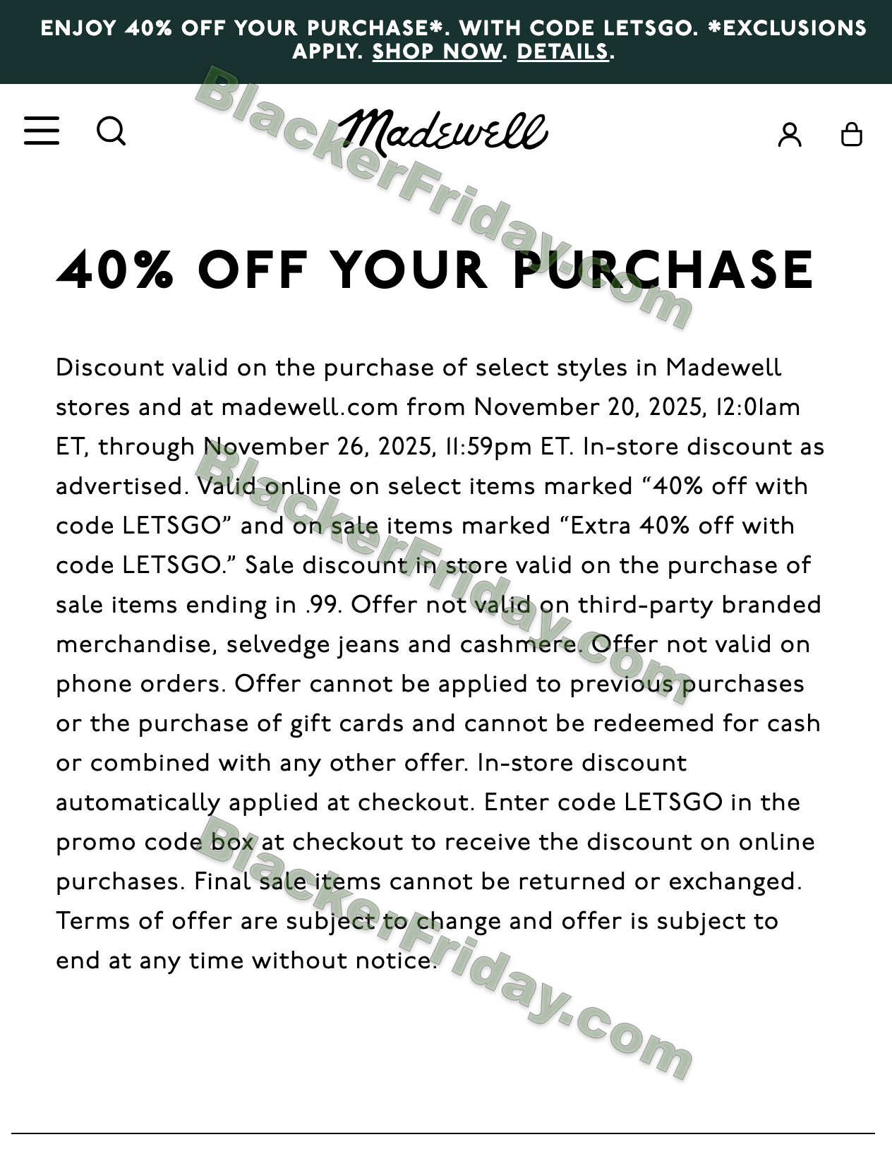 • Exclusions: Third-party branded merchandise, Madewell Forever items, gift cards, phone orders, previous purchases, and final sale items.
