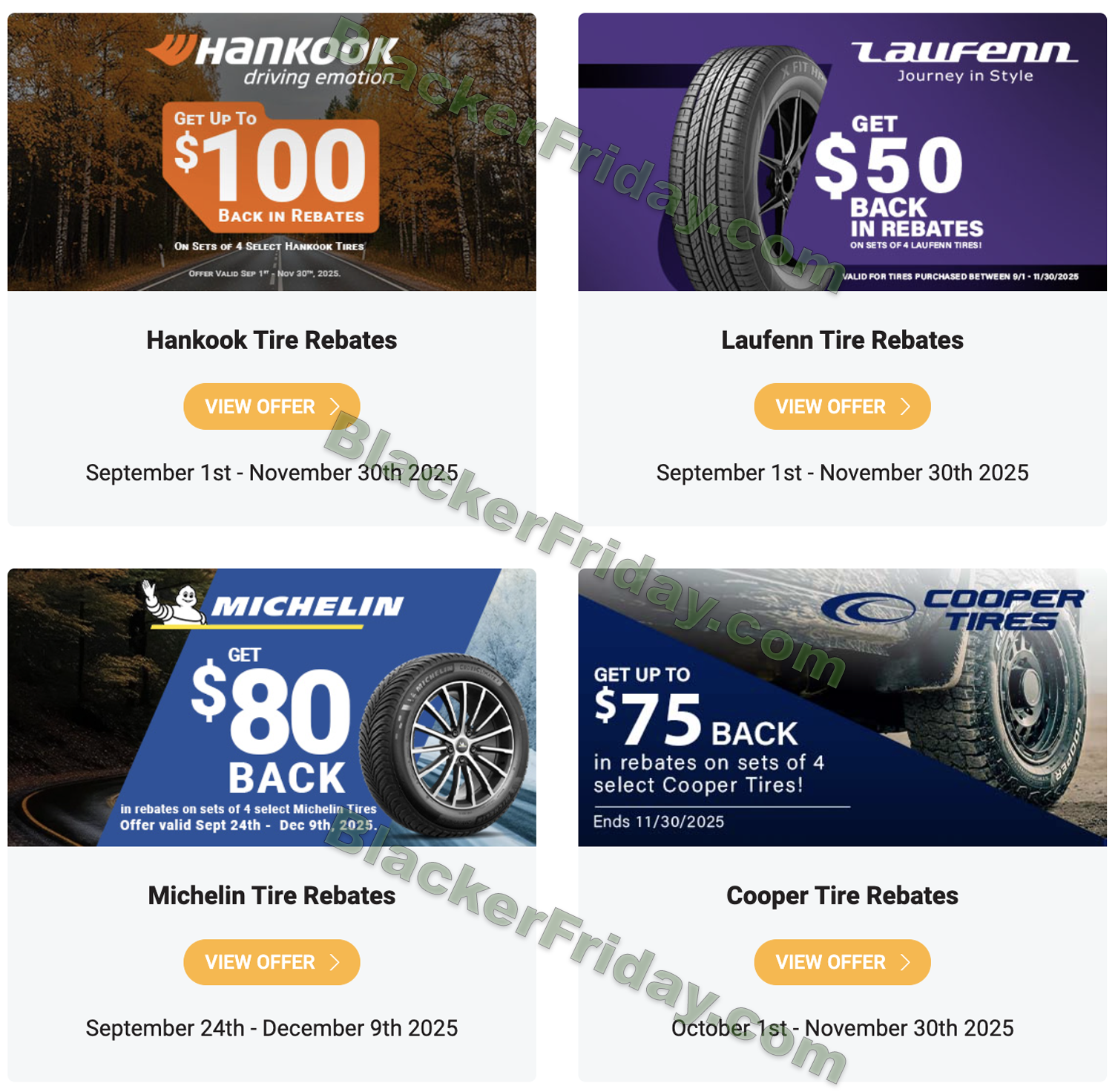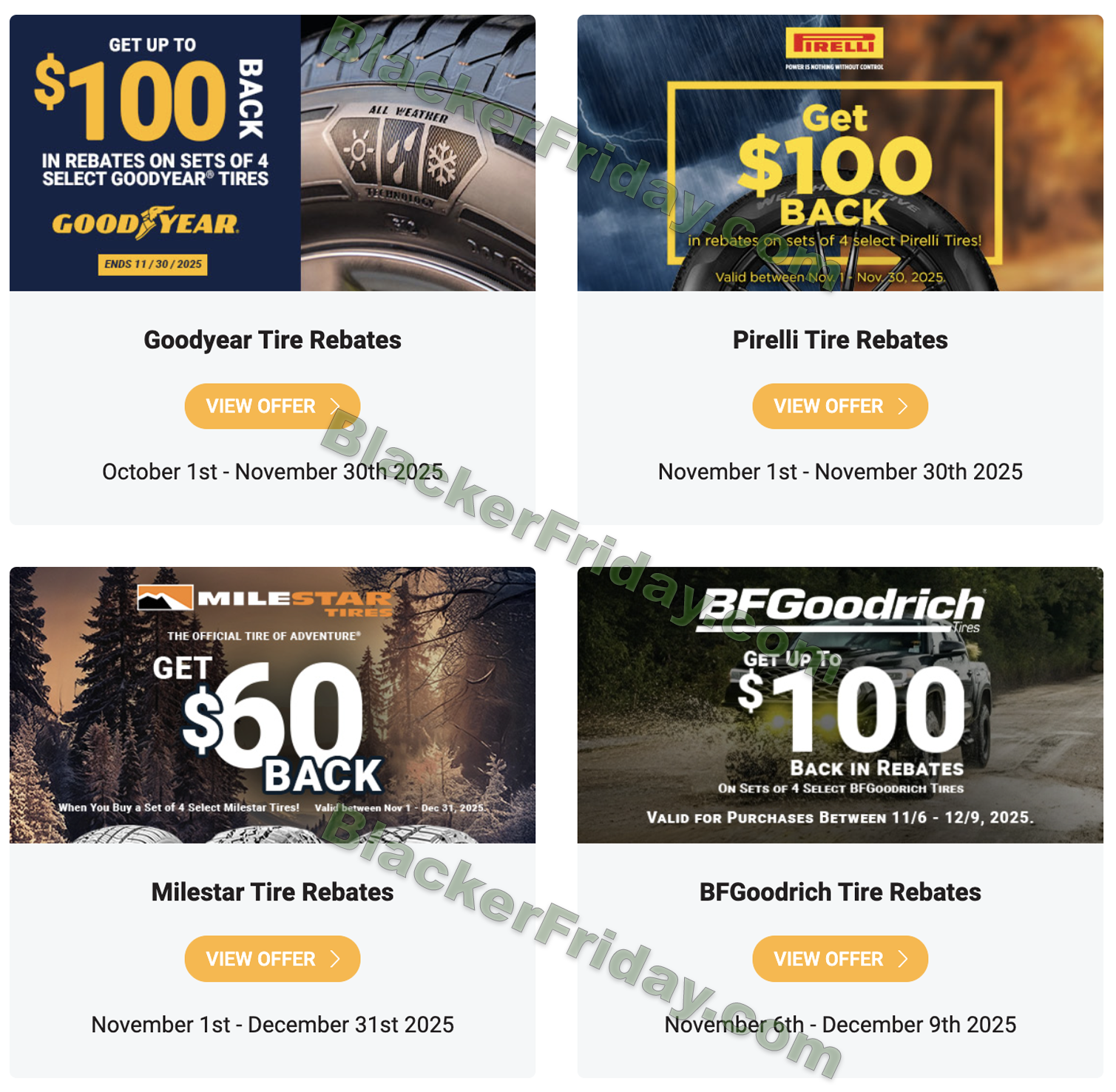 - Up to $100 back from Hankook, Goodyear, Pirelli, and BF Goodrich