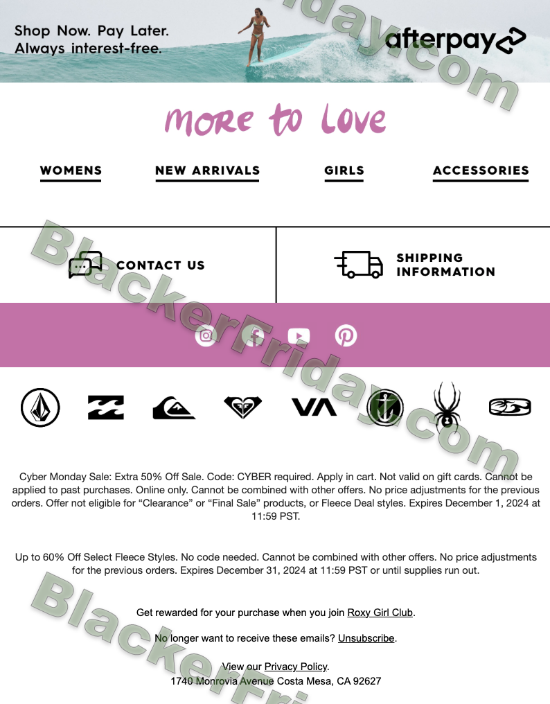 The Cyber Monday deals usually outshine Roxy’s Black Friday offers. For example, in 2024, Black Friday discounts were tiered — 50% off orders of $100 or more and 40% off smaller orders — while Cyber Monday offered a flat 50% sitewide without a minimum spend. That makes Cyber Monday the best time to buy if you’re after uniform savings across most categories.