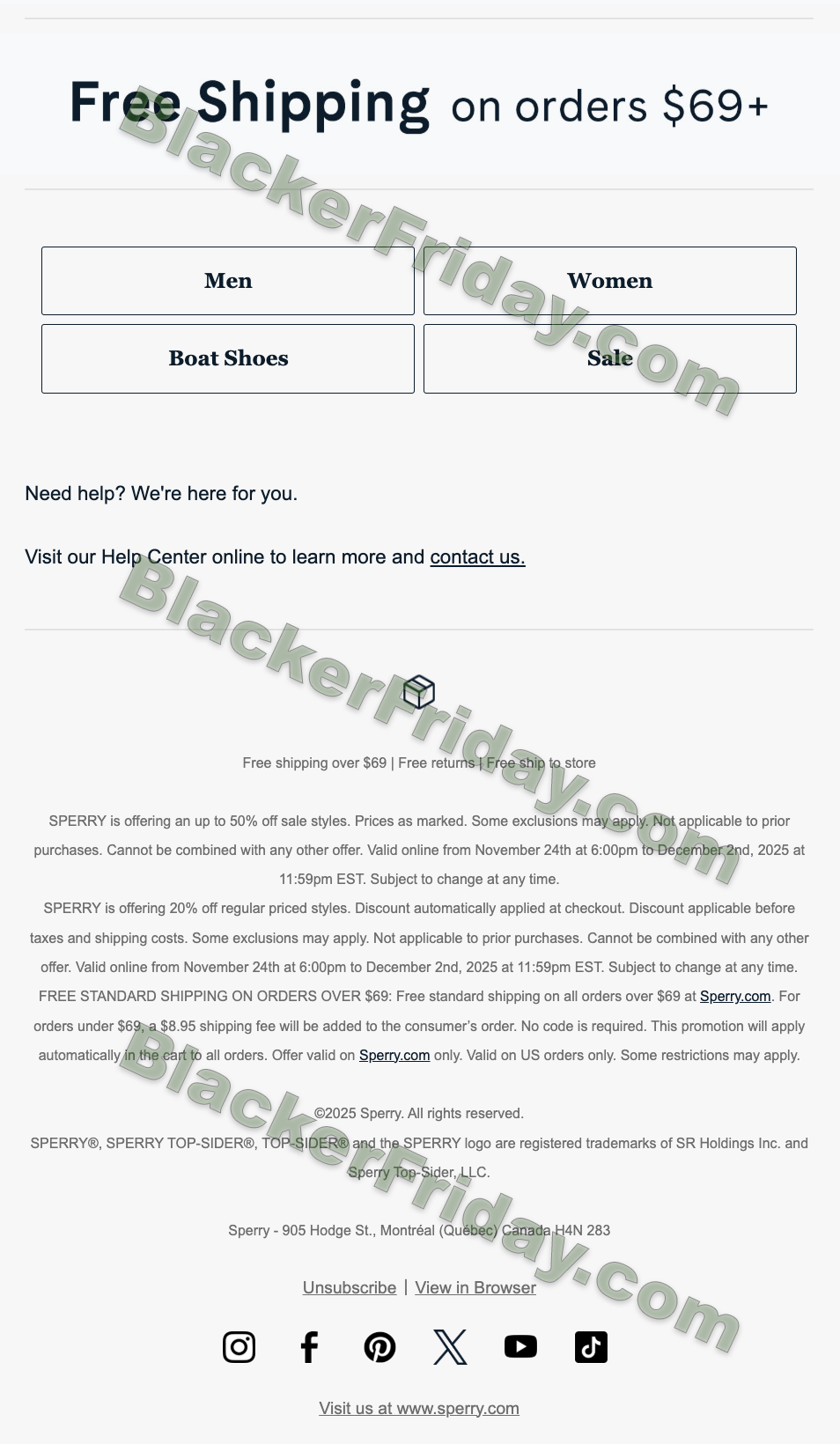 Sperry’s Black Friday sale is running online from Monday, November 24 at 6:00pm EST through Tuesday, December 2, 2025 at 11:59pm EST. The sale is available on sperry.com and may also be reflected in stores, though online timing is confirmed.