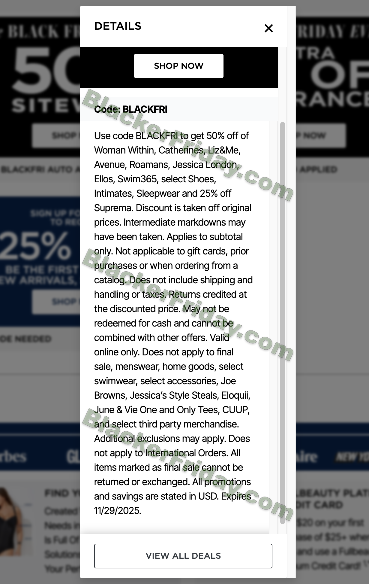 - Woman Within, Catherines, Liz&Me, Avenue, Roamans, Jessica London, Ellos, Swim365, select shoes, intimates, and sleepwear: 50% off original prices.