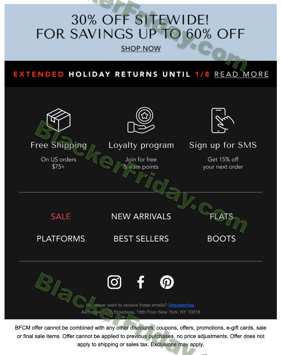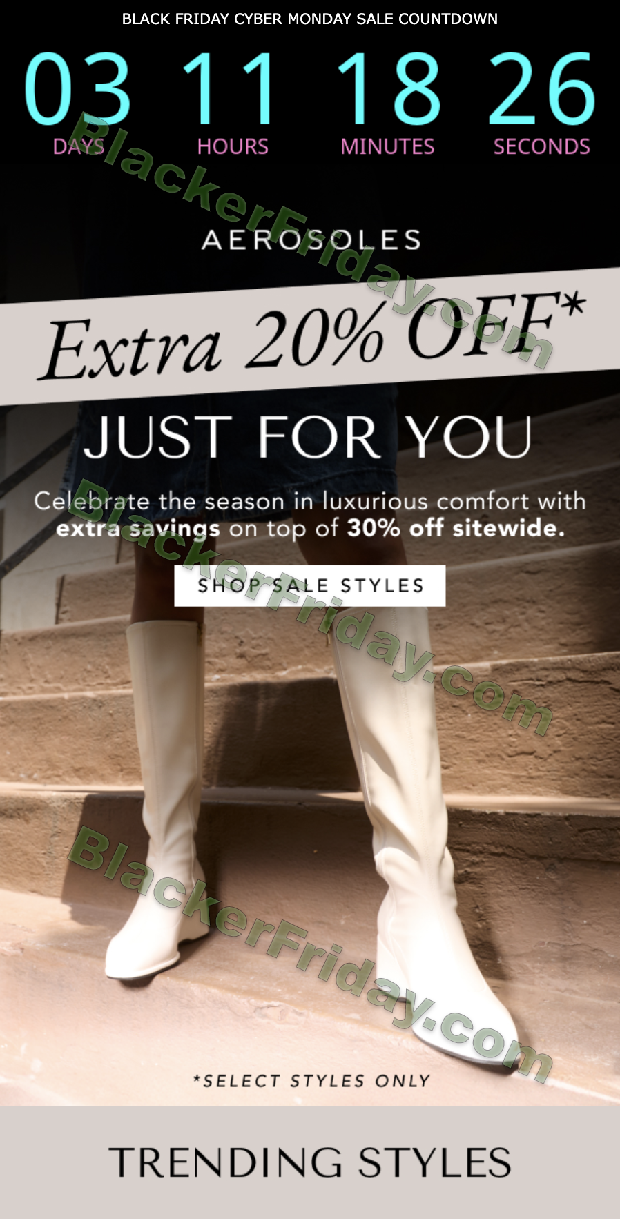 Last year, Aerosoles offered up to 50% off sale and clearance boots and 30% off sitewide on nearly everything else at aerosoles.com. On Cyber Monday itself, an extra 20% off brought some items to a total of 60% off. Restrictions typically applied: the offer could not be combined with other promotions, coupons, or prior purchases, and it did not cover shipping or taxes. Some exclusions were also in place, mostly for items already deeply discounted or part of final sale inventory.