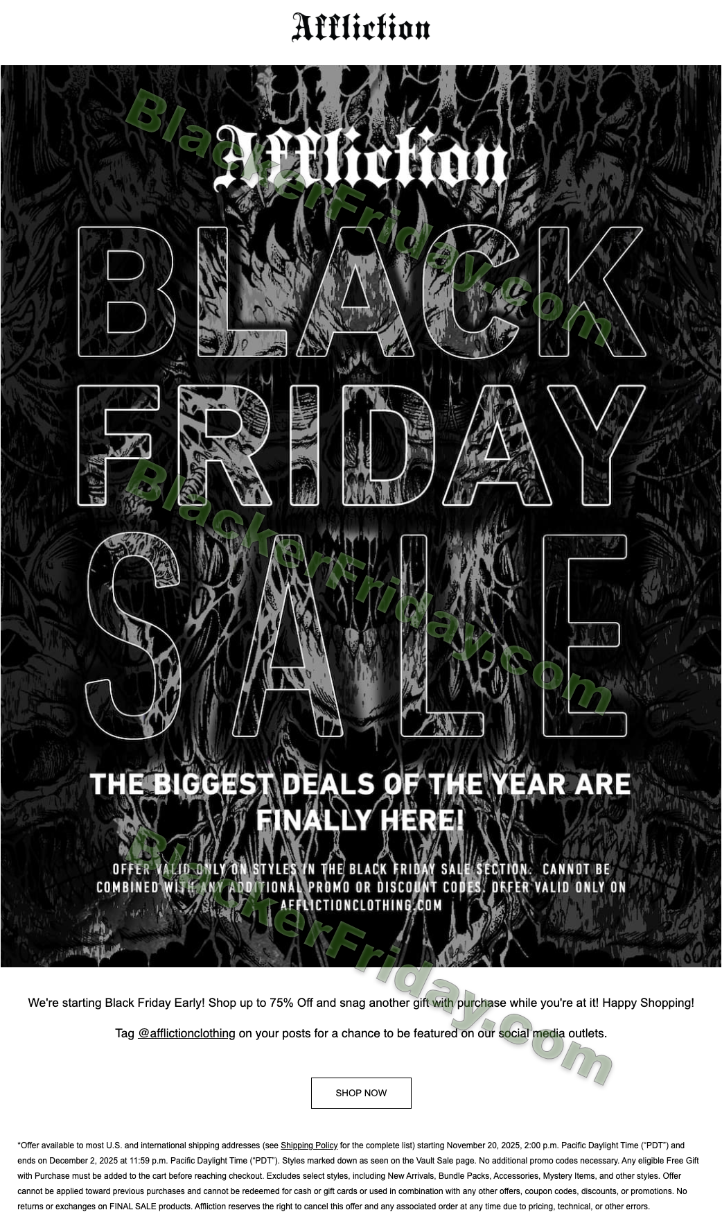 Updated on Friday, November 21, 2025: Affliction’s Black Friday 2025 sale is now live! Let’s break down the confirmed details, including the sale dates, discounts, gift offers, and tips for getting the most out of the event.