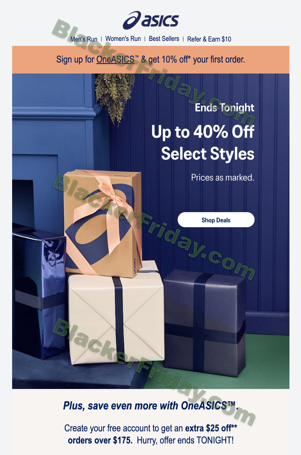 Extra $25 Off Orders Over $175 for OneASICS Members Members of the OneASICS loyalty program have previously been able to apply an additional $25 off orders of $175 or more. A promo code is typically required while logged into a OneASICS account.