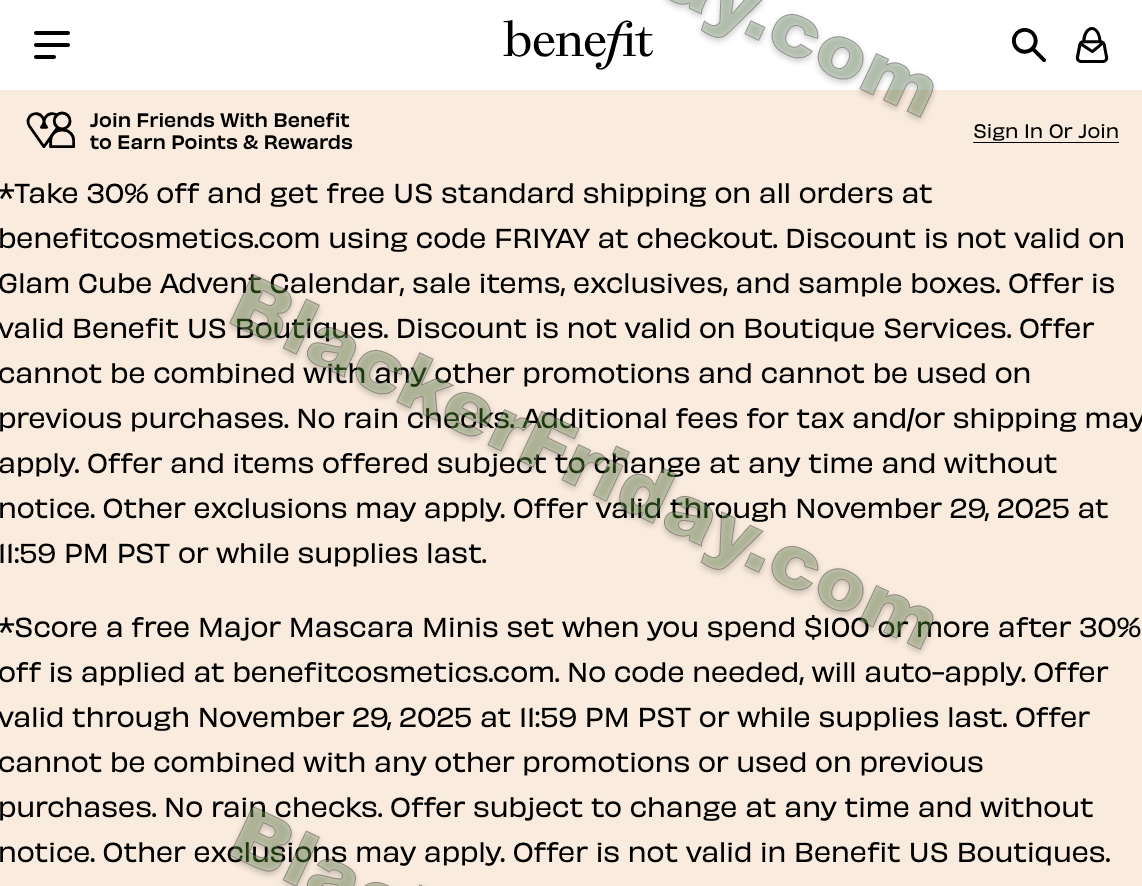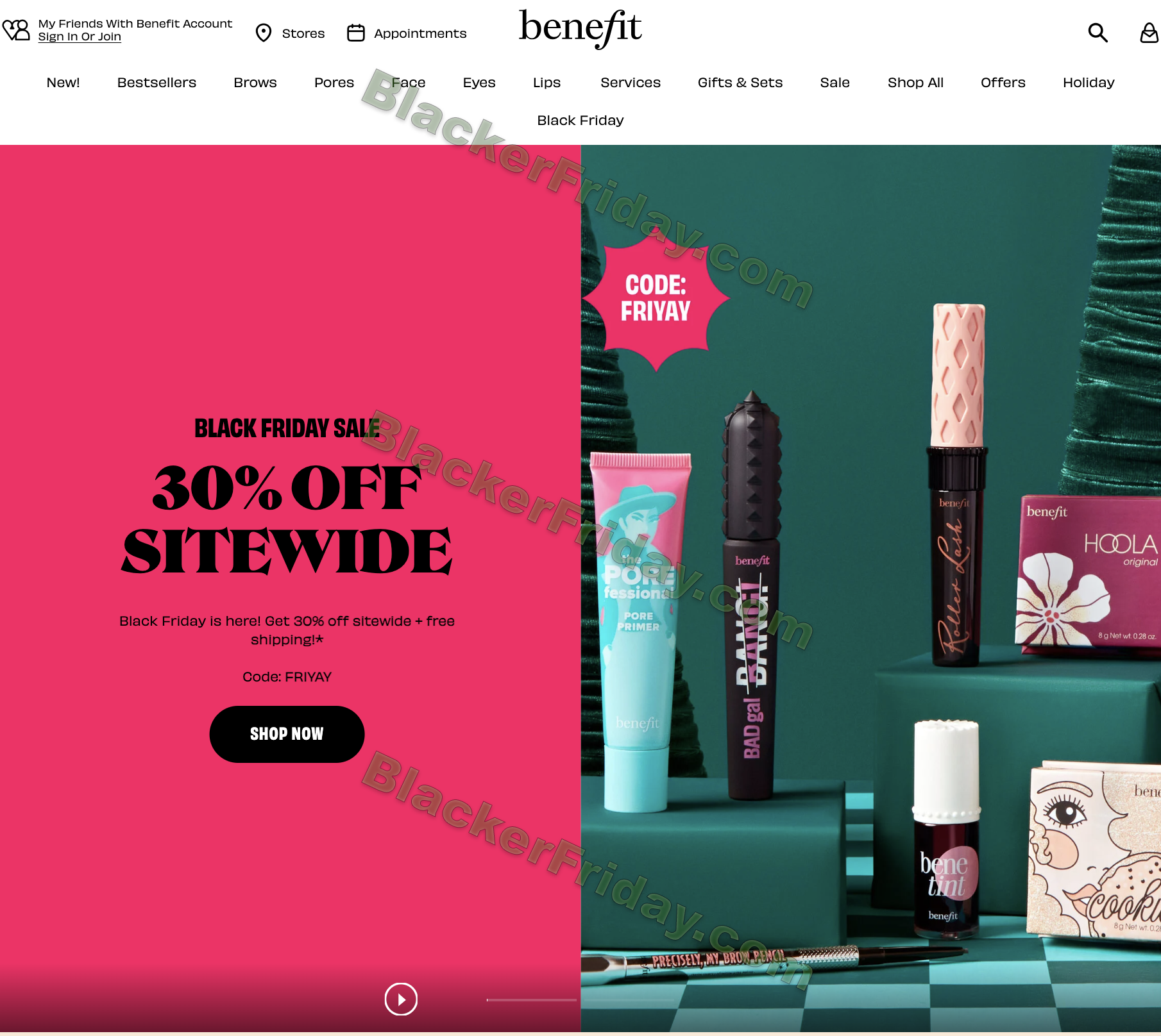 • Take 30% off all orders at benefitcosmetics.com using promo code FRIYAY at checkout. Free U.S. standard shipping is included.