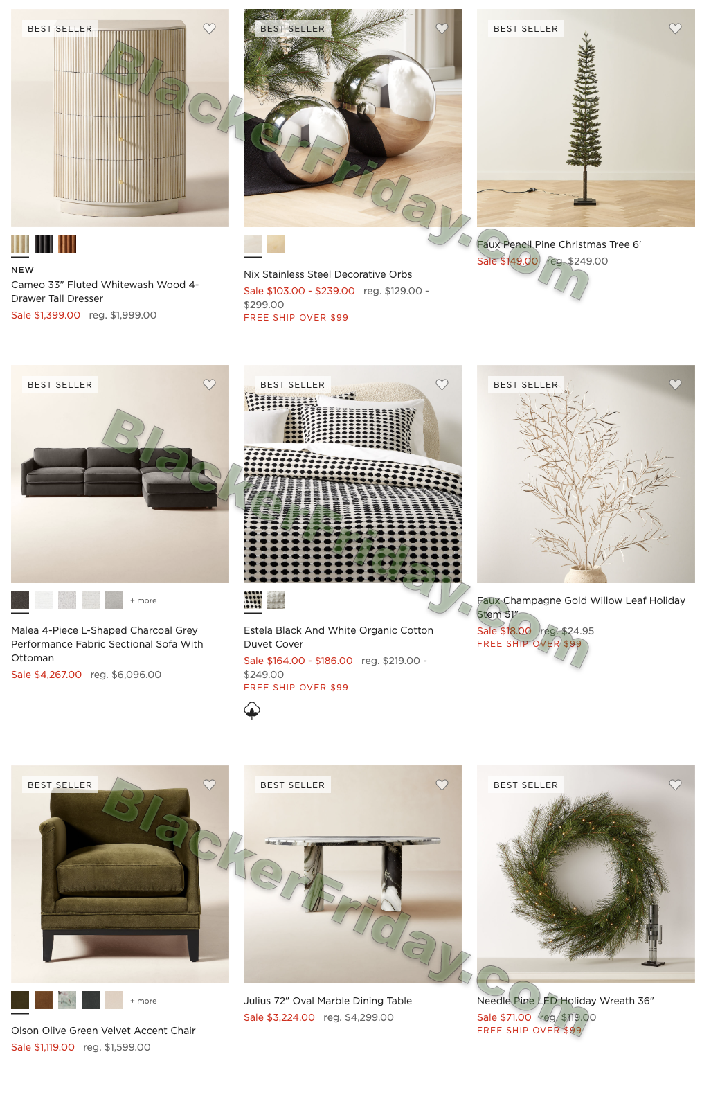 Various dining tables, sofas, accent chairs, and holiday décor with steep markdowns.