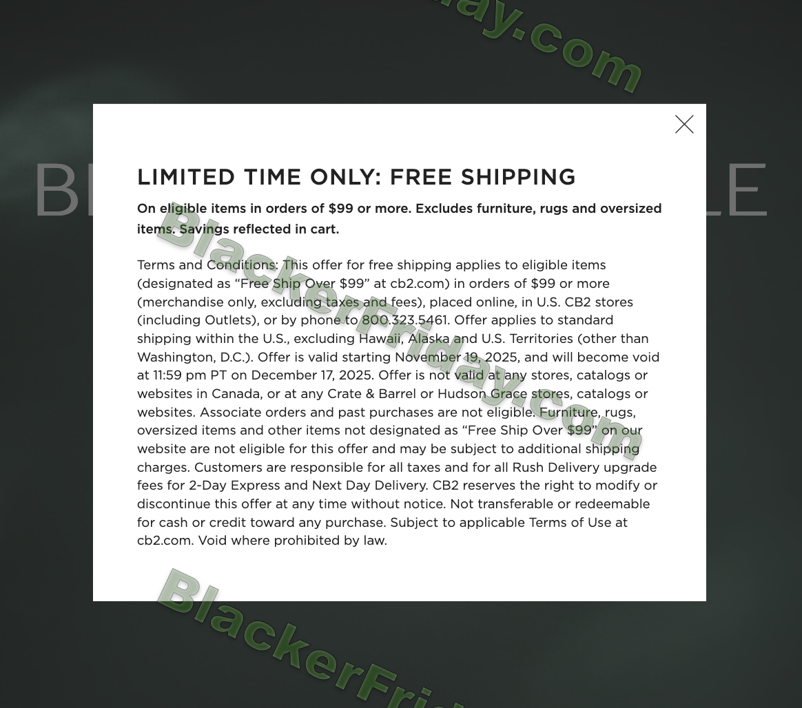 CB2 is offering free standard shipping on eligible items with orders $99+. Exclusions include furniture, rugs, oversized items, and items not marked “Free Ship Over $99.” Shipping is valid for orders in the U.S. (excluding Hawaii, Alaska, and U.S. Territories other than D.C.) and applies to online, in-store, and phone orders.