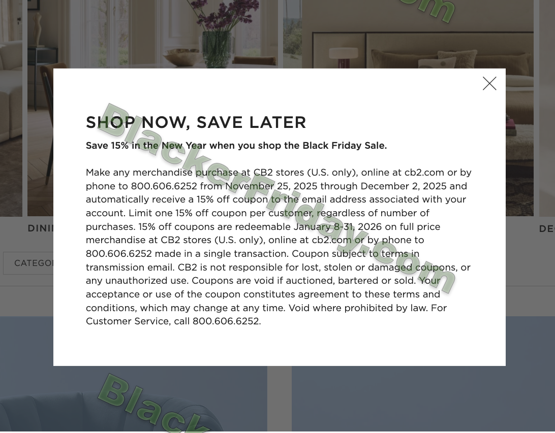 You can shop the sale in person at any U.S. CB2 store, online at cb2.com, or by phone at 1-800-606-6252. Most discounts apply across all channels, but inventory may vary by location.