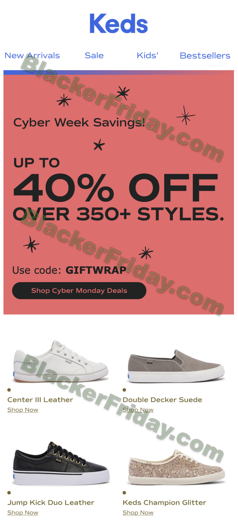 The core offer is expected to be 40% off on over 350 styles with a promo code, typically a better offer than the one run a few days earlier on Black Friday (usually at 35% off sitewide). Last year, the code was “GIFTWRAP,” possibly they will reuse the same one. The discount usually applies to both full-priced and many sale items, but some exclusions remain. Keds Champion Originals Lace Ups and Slip Ons, doorbuster styles, and gift cards were excluded in past sales, and similar restrictions are likely.