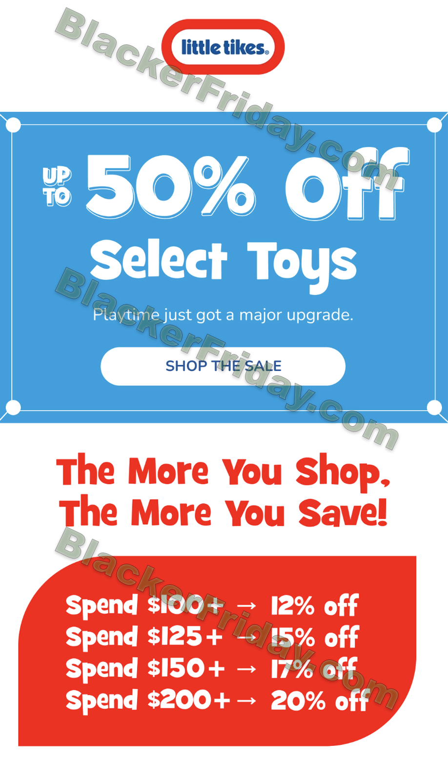 Little Tikes is offering a mix of item-specific discounts and tiered savings based on your order total: