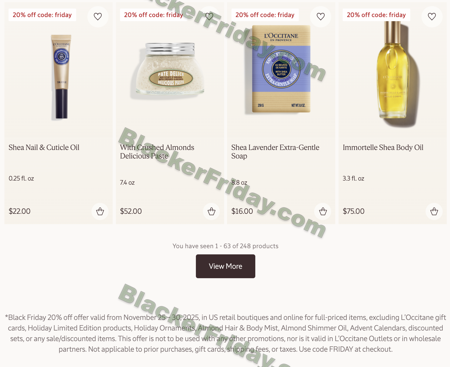The sale is available from November 25 through November 30, 2025. It is valid in U.S. retail boutiques and online at loccitane.com. To receive the discount online, you must enter the code FRIDAY at checkout. In-store purchases apply automatically.