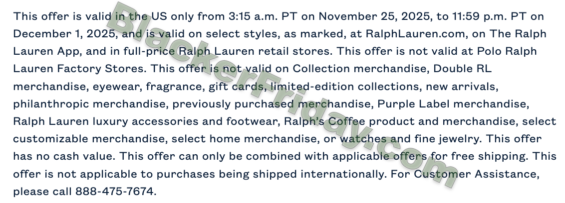 The sale runs in the U.S. from 3:15 a.m. PT on Tuesday, November 25, 2025, through 11:59 p.m. PT on Monday, December 1, 2025. Shoppers can find the discounts at ralphlauren.com, on The Ralph Lauren App, and in full-price Ralph Lauren retail stores. Note that Polo Ralph Lauren Factory Stores are not participating in this promotion.