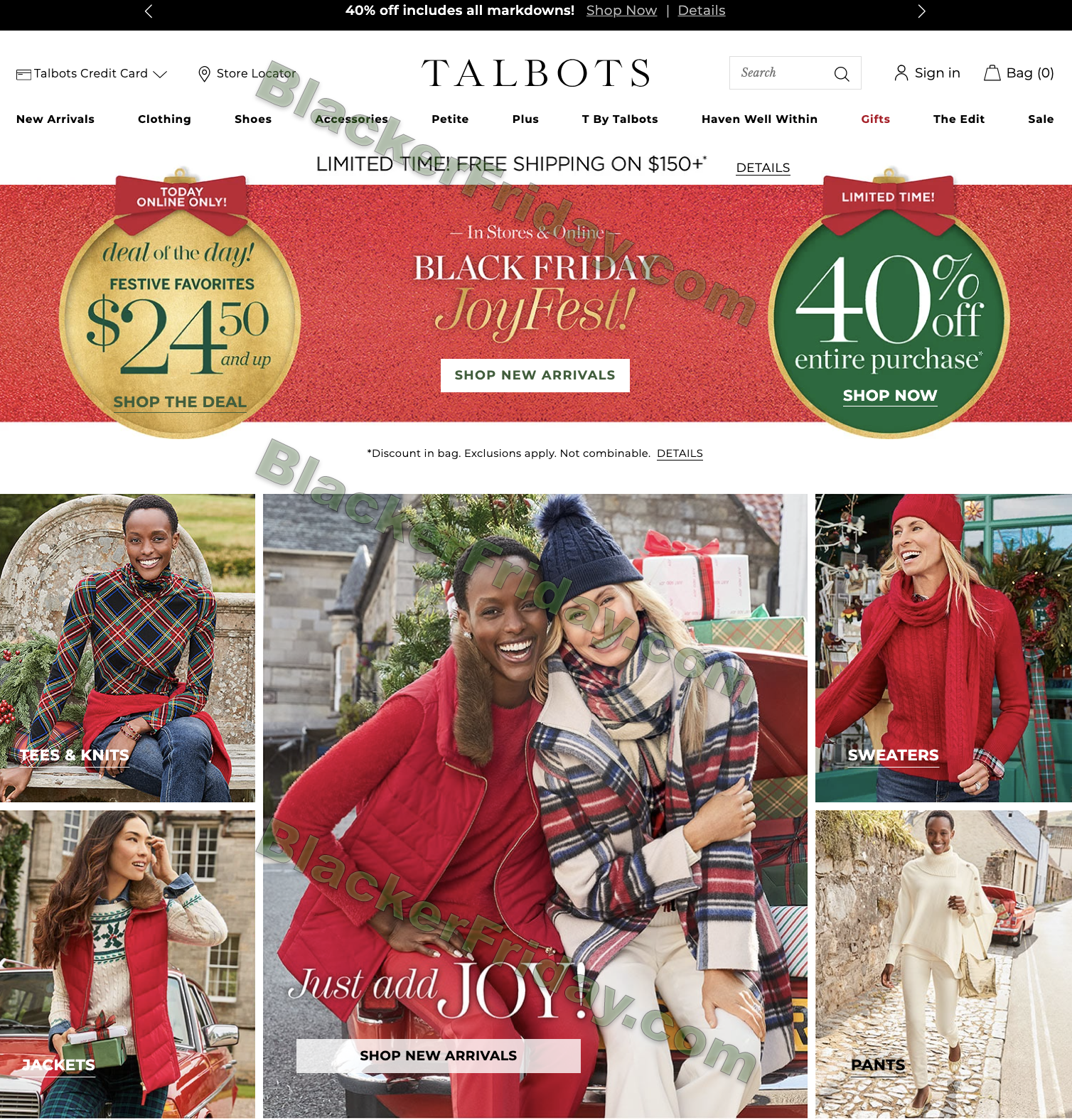 - Monday, November 24 – Saturday, November 29, 2025: 40% off your entire purchase. This applies to full-price items and is valid online at talbots.com, by phone at 1-800-825-2687, and in Talbots retail stores.