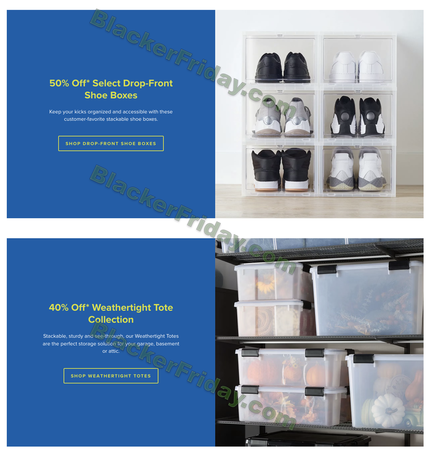 Storage and Organization Solutions: Modular shelving, drawer organizers, pantry containers, and stackable bins are included in the sitewide 30% off. Online-exclusive offers include select Weathertight products and Drop Front Shoe Boxes at significant discounts.
