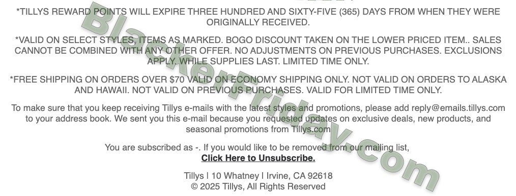 Tilly’s Black Friday event is officially underway online at tillys.com and in select stores. Key timing details: