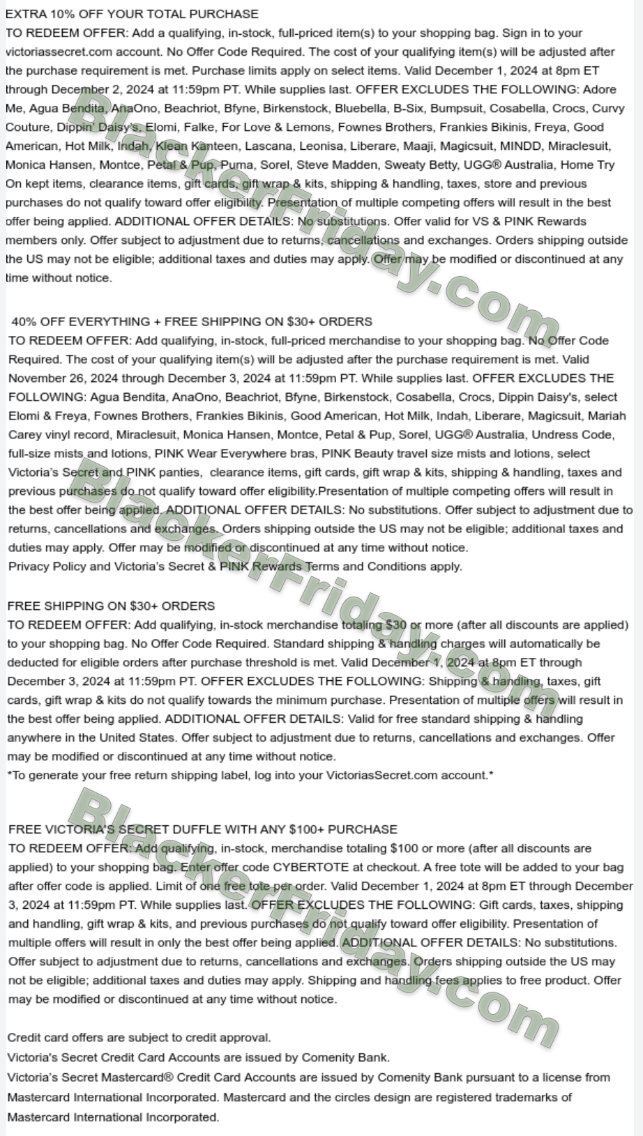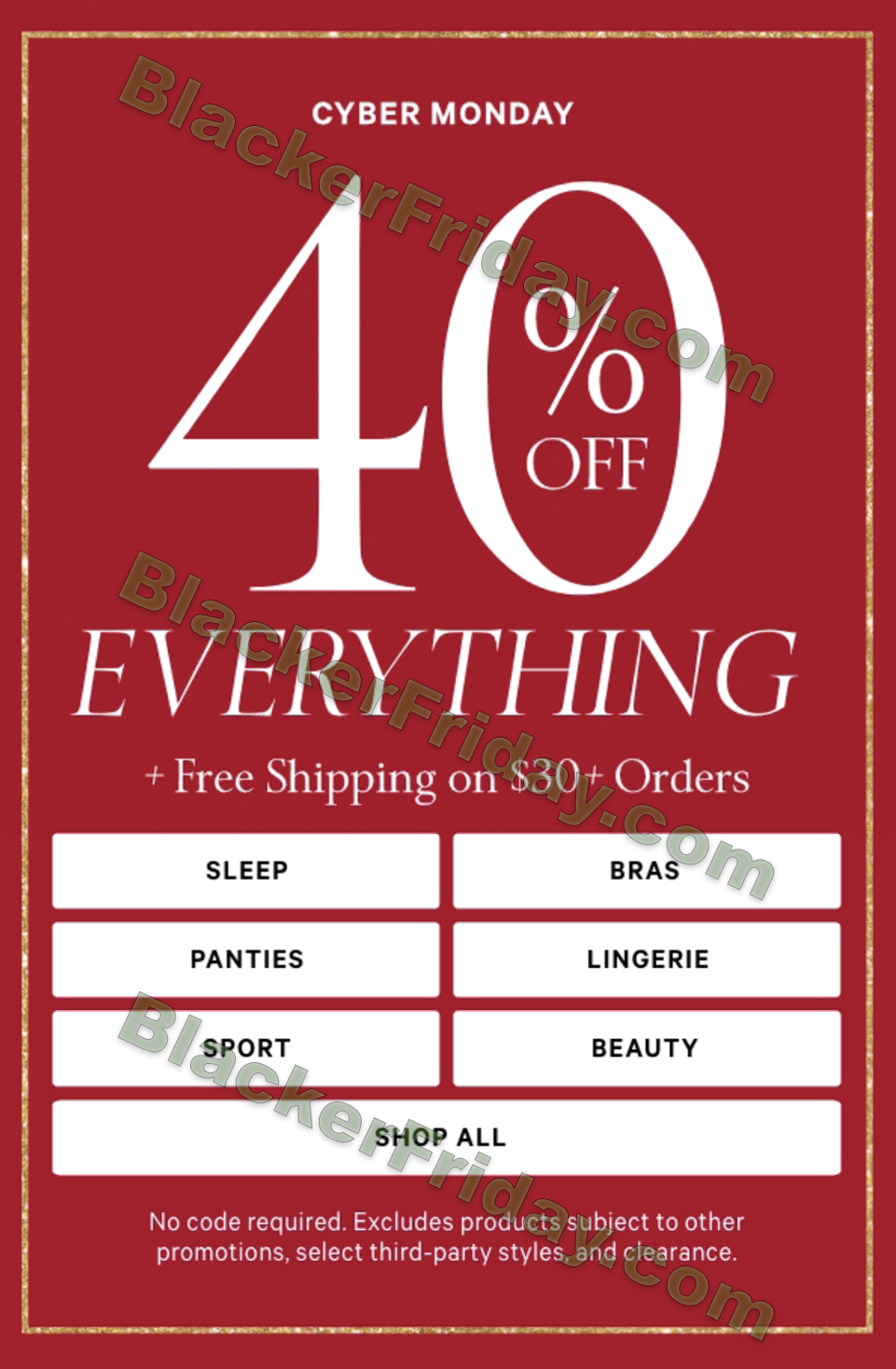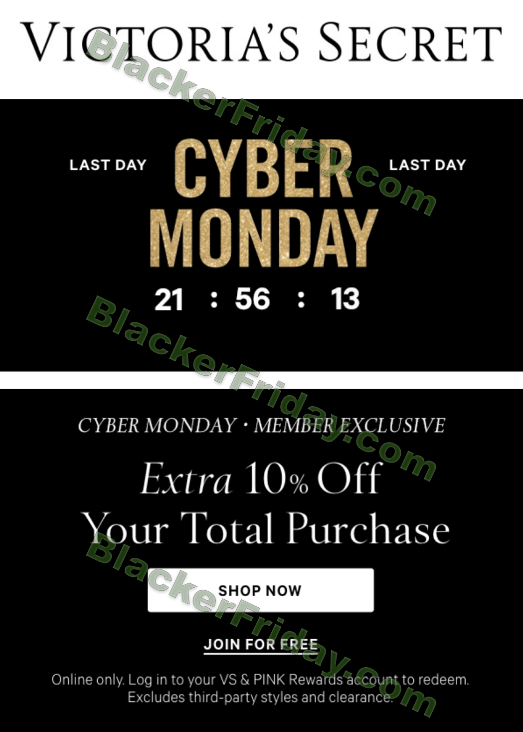 Victoria’s Secret Cyber Monday events usually include several overlapping deals. Here’s what to expect based on last year’s promotions and official terms: