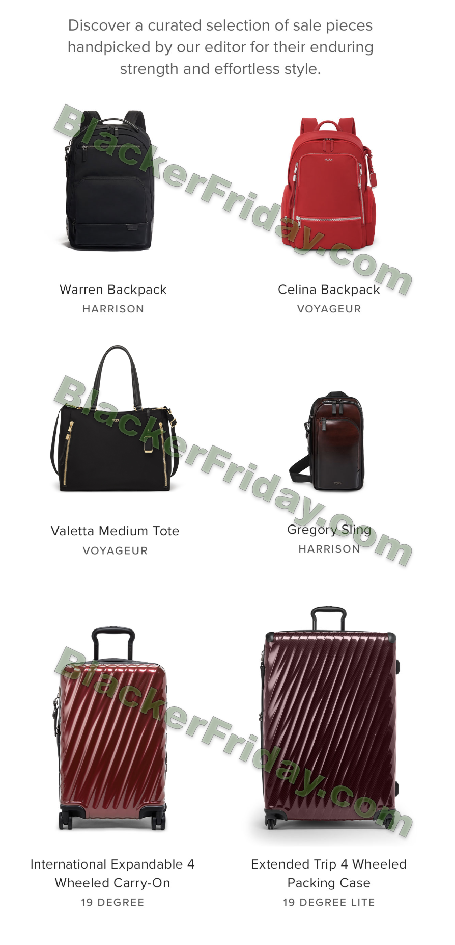 The discount is not storewide, TUMI selects a range of products across categories for markdowns. Typically: