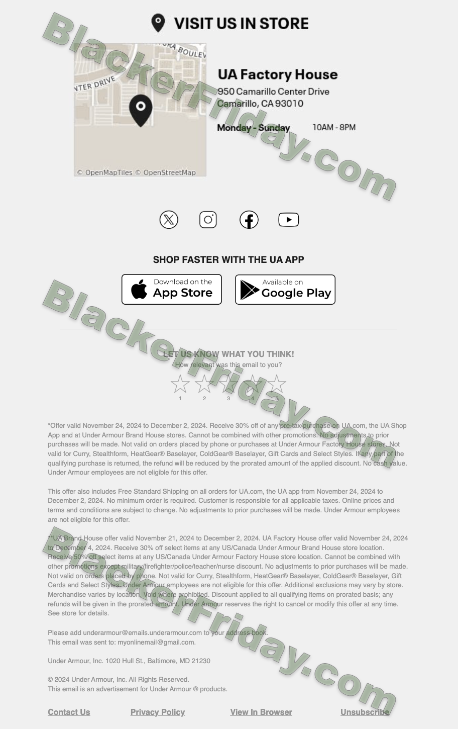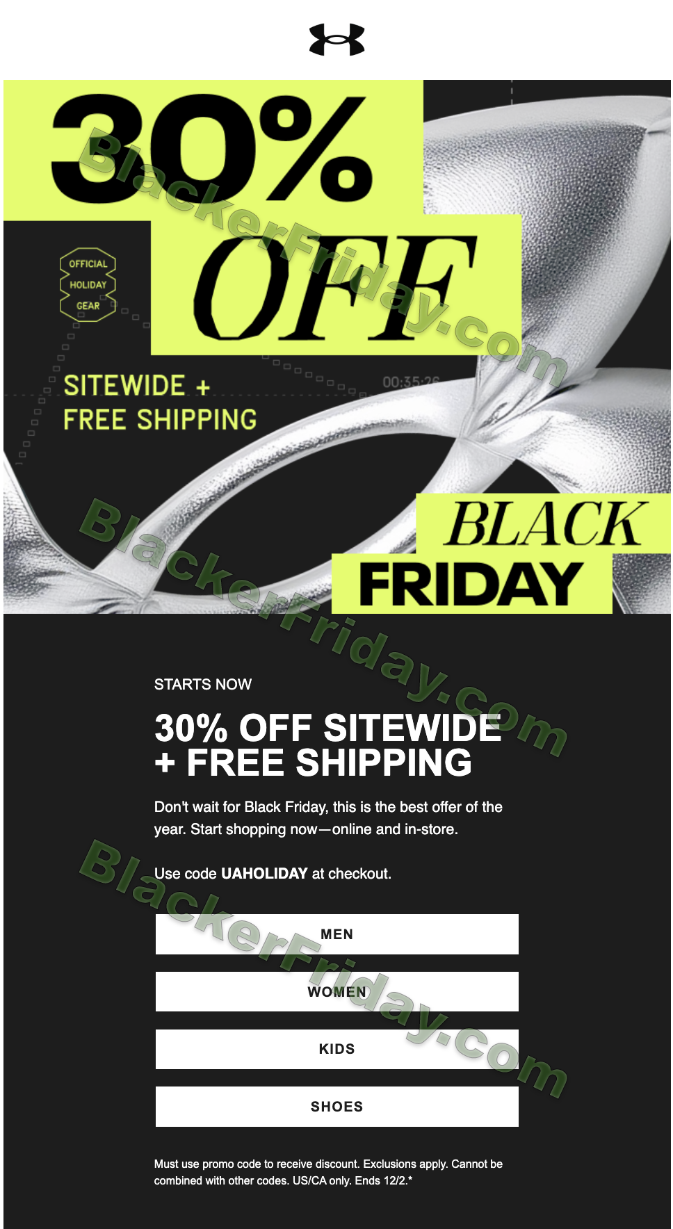 In recent years, Under Armour has included free standard shipping with no minimum purchase during the Black Friday through Cyber Monday period.