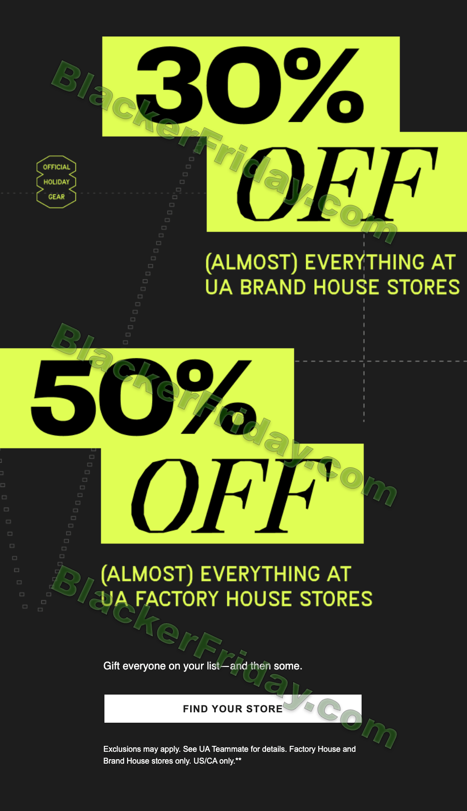 Under Armour has repeatedly offered about 30% off most full price items available on underarmour.com and in UA Brand House stores. Online shoppers have historically activated the discount with a promo code at checkout. Outlet categories usually see deeper markdowns. Savings of up to 50% off select outlet items have been common both online and in UA Factory House locations.