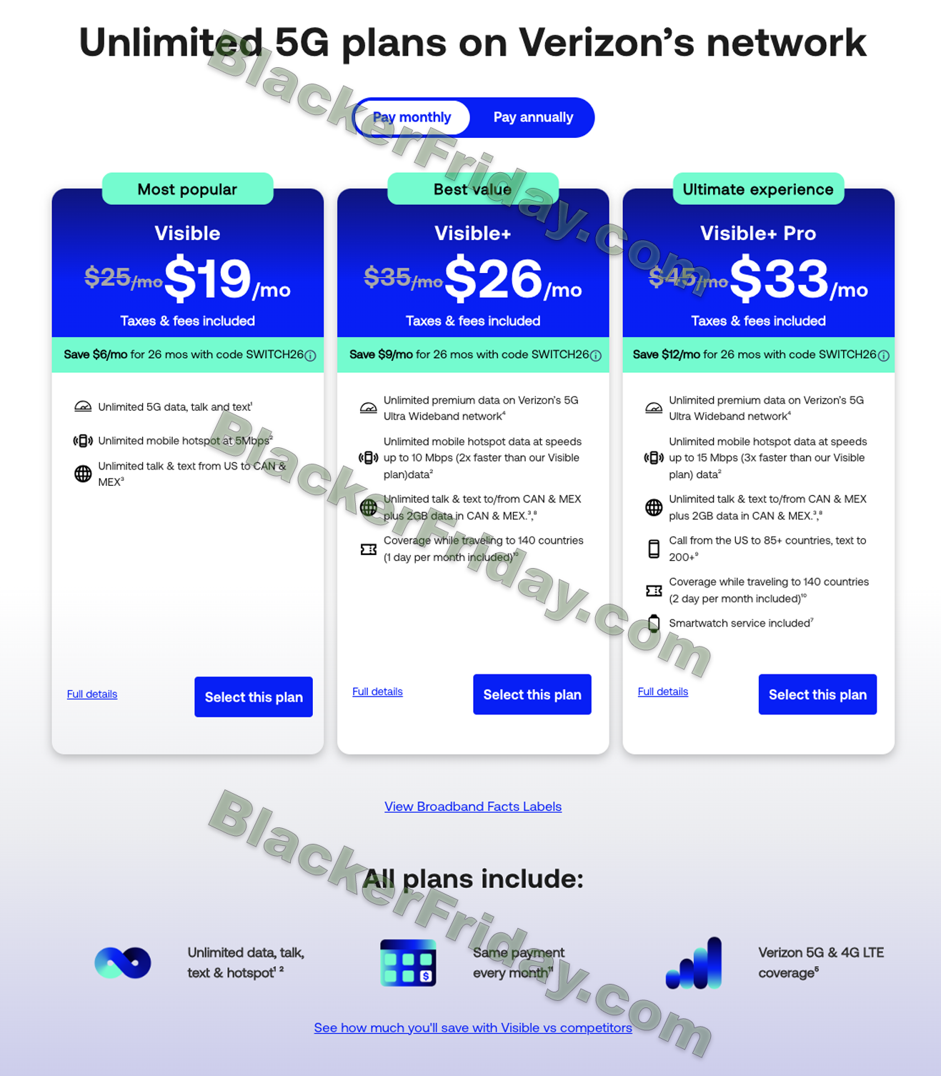 - Visible+ Pro Plan ($45/mo): $12/month off for 26 months