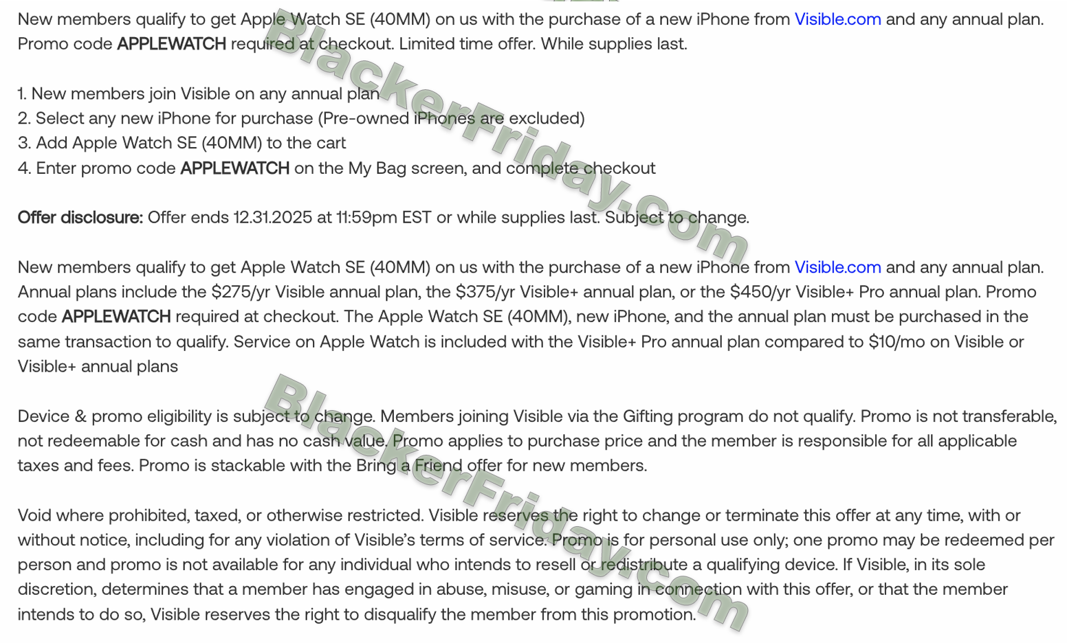 - Apple Watch SE (40MM) Free: Add any new iPhone and a Visible annual plan to your cart, use code APPLEWATCH, and get the Apple Watch SE included at no extra cost.