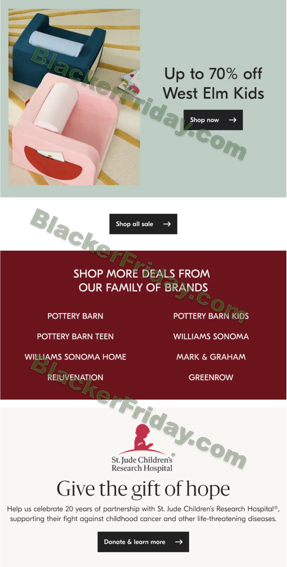 - Kids line (West Elm Kids): up to ~70% off