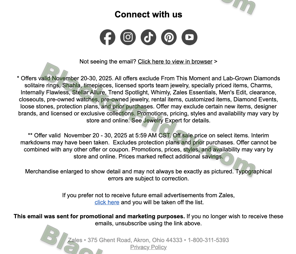 Zales’ official Black Friday 2025 sale runs from Thursday, November 20 through Sunday, November 30, 2025, at 5:59 AM CST. A separate Cyber Monday sale will follow afterwards. The sale is available both in-store and online at zales.com.